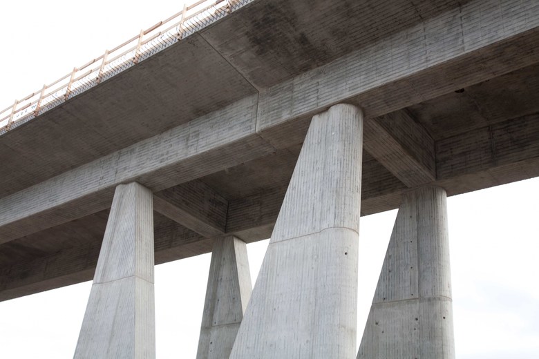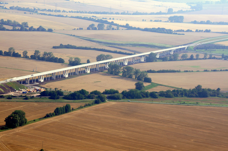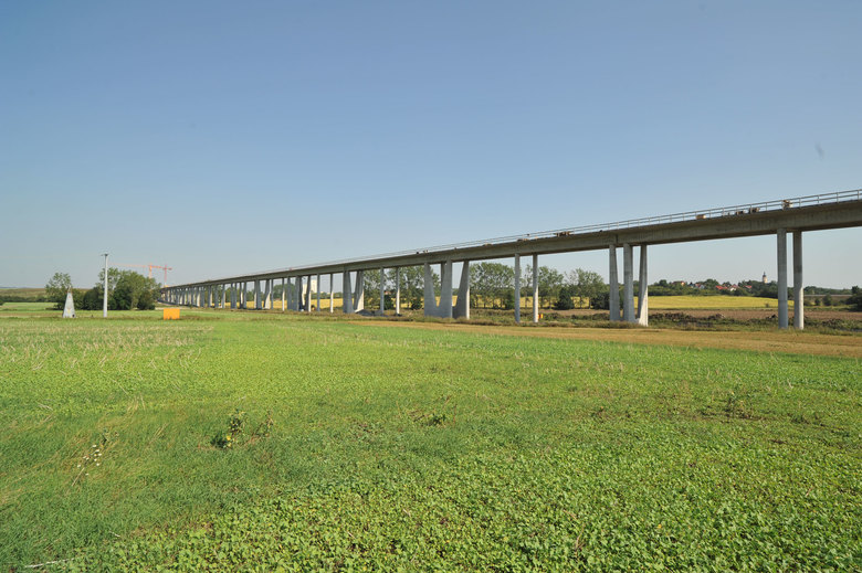 As part of the new high-speed railway route Erfurt - Leipzig/Halle, the delicate bridge spans across the elongated, shallow valley. The double- webbed prestressed concrete superstructure is sectioned into tenfield joint- and bearing-less beams. The horizontal (transversal) load transfer is achieved through restraints at the abutments and reinforced concrete frames along the transition column axes between two sections. The breaking loads are transferred to the foundations through stiffer bents consisting of triangular walls, arranged at the center of each five-field beam. The bridge allows for continuous rails without rail expansion joints. The reduced structural height due to the minimal column spacing as well as the slender individual columns result in a light-weight and elegant structure. The bridge distinguishes itself through its robust and reduced structure as well as its minimal maintenance requirements.