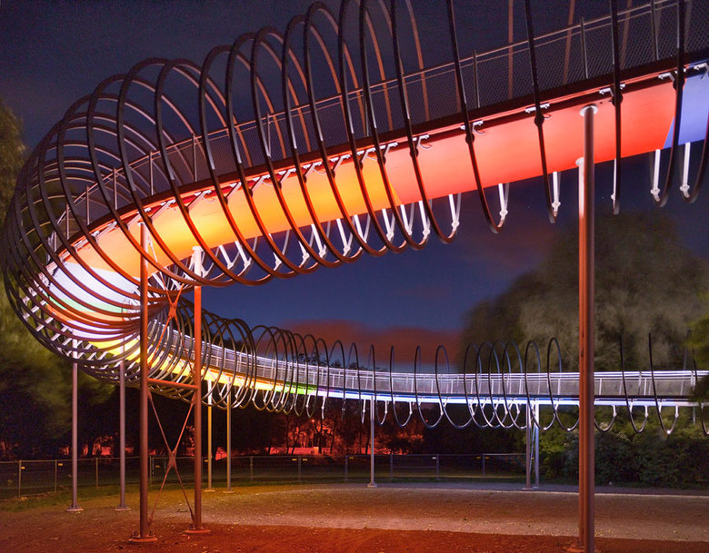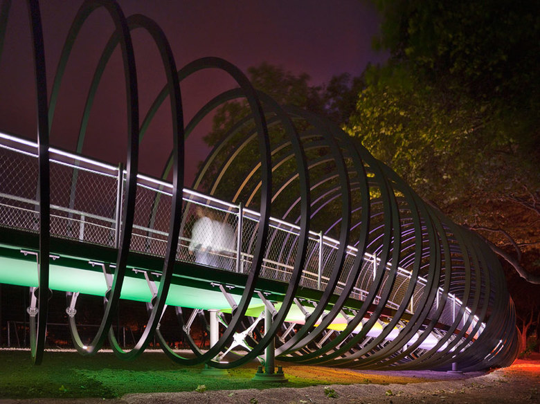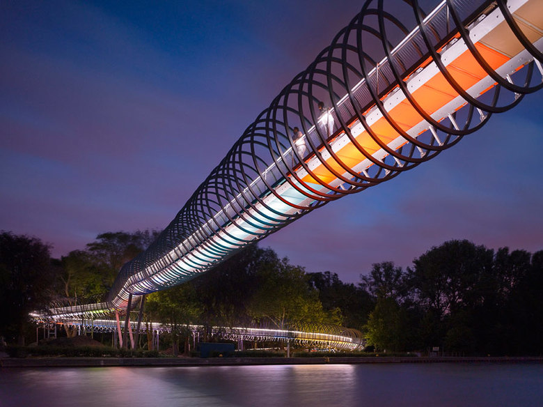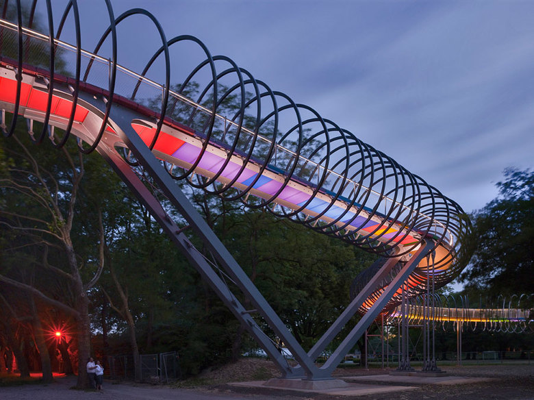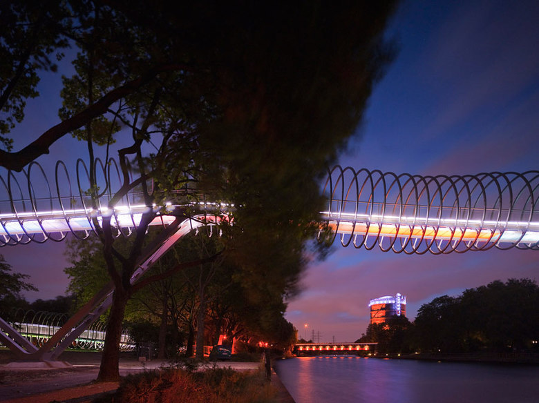 The elegant pedestrian bridge across the Rhein-Herne canal is a part of the project "EMSCHERKUNST 2010". Following the design of the artist Tobias Rehberger, a colorful ribbon wrapped in a light, swinging spiral connects the two existing parks. The lightness of this design is due to the minimalist structural design of the stress ribbon bridge. Two steel ribbons made of high strength steel connect to the inclined supports across the canal. The resulting tension force is transferred into strong abutments through the outer vertical tension rods. The walkway consists of pre-cast concrete plates, bolted to the stress ribbon, to which the railing and spiral are attached. The springy synthetic pavement of the walkway as well as the colorful rhythmization of the concrete and coating amplifies the dynamic experience of the bridge. Railings made of steel and cable nets effectively add to the dampening of this animated bridge.