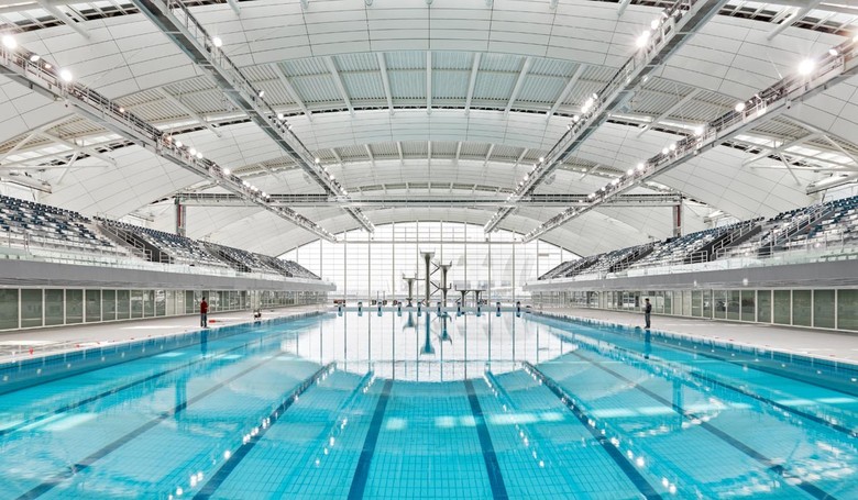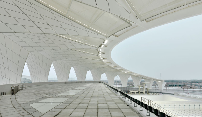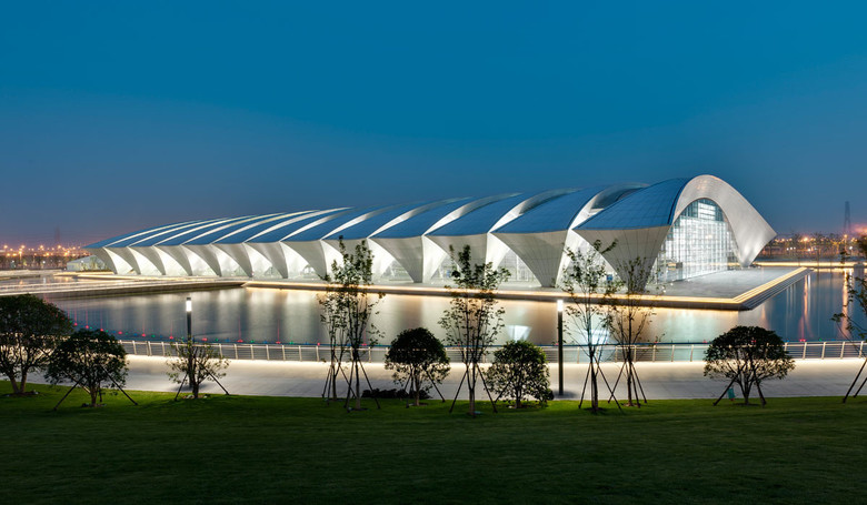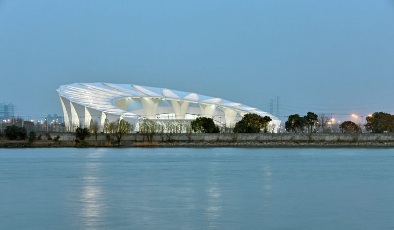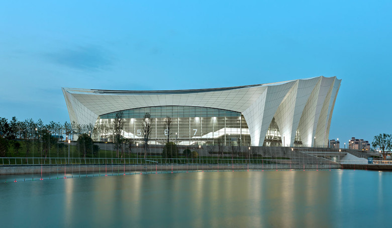 The expansion of the existing sports center located along the bank of the Huangpu hosts the FINA Swimming World Championship 2011. Along the shore of an artificial lake three stadiums and one media center were developed. A shared formal idiom and use of material unify the three sports buildings: longspan steel structures with large-format rectangular elements made of coated aluminium sheets evoke the image of sails in the wind. The hall stadium with a round ground plan and an encircling, 35 m high foyer with glass facades will later be used for other sports and cultural events. The roof structure of the rectangular swimming hall (“Natatorium”) is made of sectional steel girders with triangular glass surfaces and spans over four pools in a row. Roof trusses with a leightweight membrane cantilever above the circular grandstands of the outdoor pools, providing protection against sun and rain.