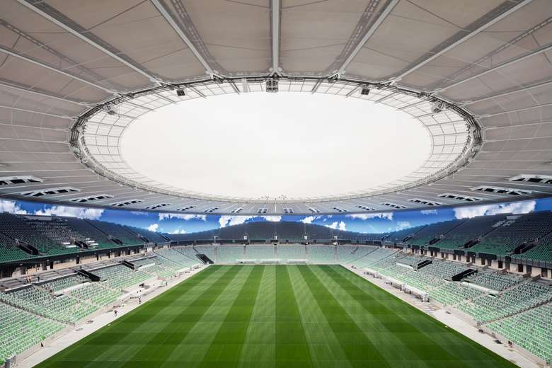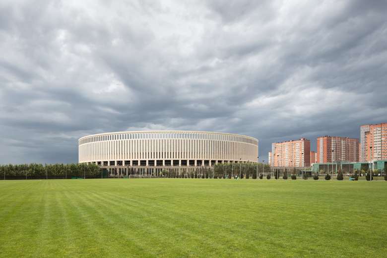 This football stadium is the first building in Russia to have a cable supported roof structure. High earthquake and snow loads, poor subsoil conditions and technical demands of the local authorities represented challenging boundary conditions. The developed spoked wheel roof consists of two uncoupled compression rings and one tension ring. The floating upper compression ring has a sliding pendulum bearing in order to balance shifting at the eight throughout joints of the concrete stadium bowl. The lower compression ring rests on steel columns. Wind bracings in the main axes provide the necessary stability. The space between the upper and the lower membrane houses the building services. A floating glass roof forms the inner edge of the roof; spring dampers were specially developed for this project to control the movements of the glass roof elements. Thus, an earthquake-proof stadium with a lightweight roof could be realized.
