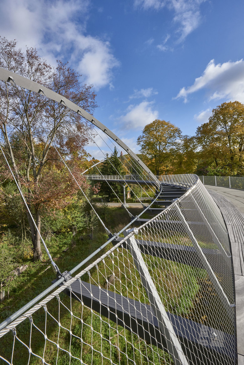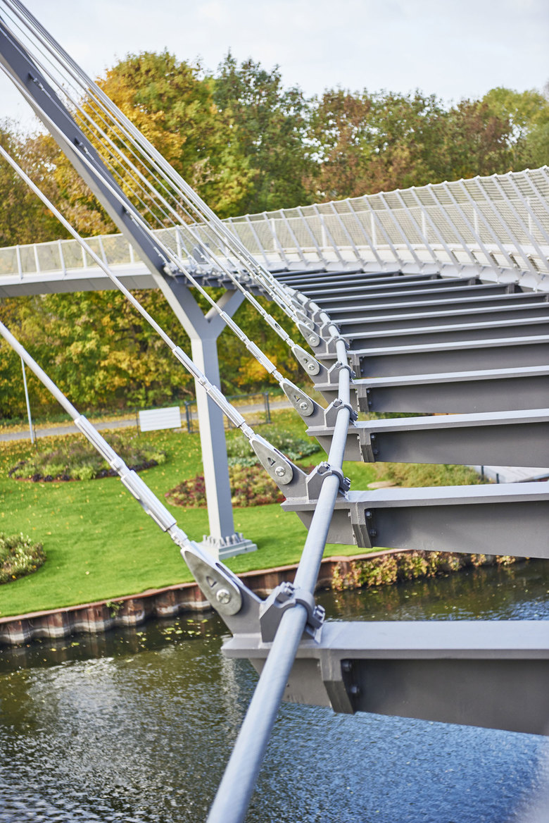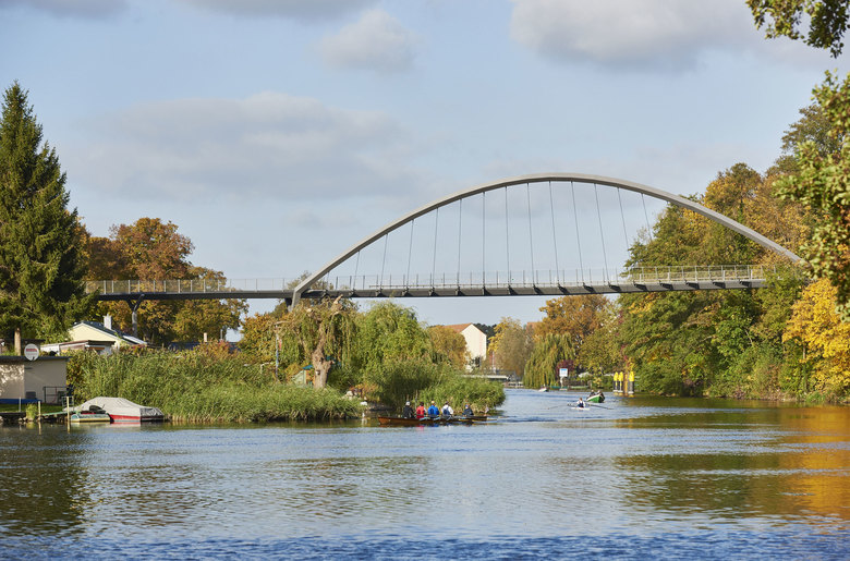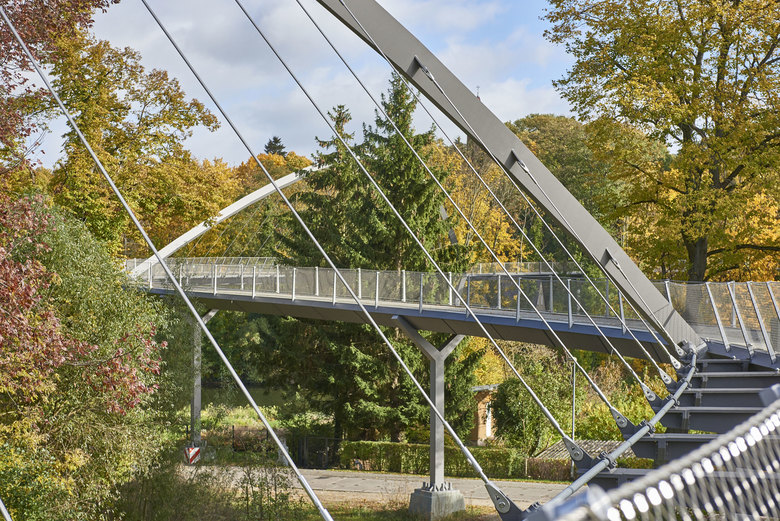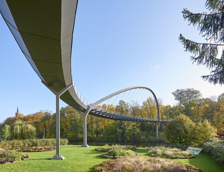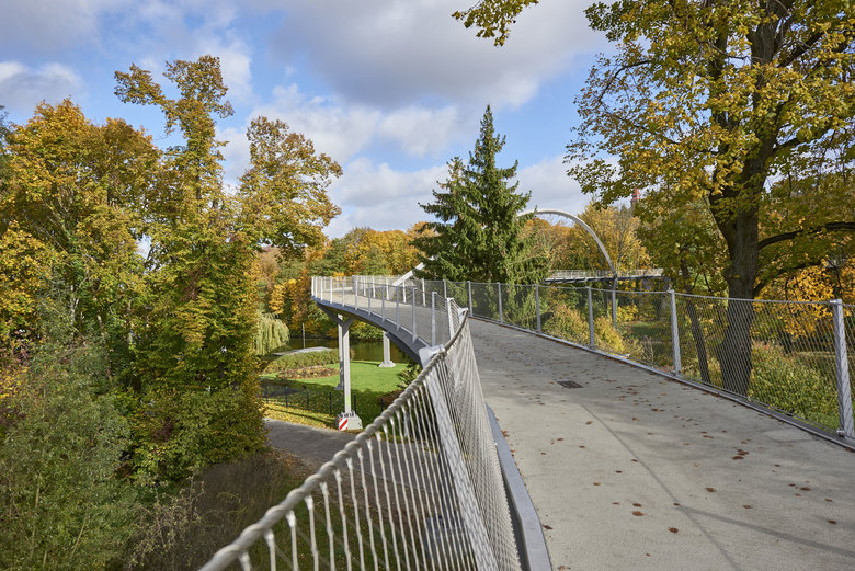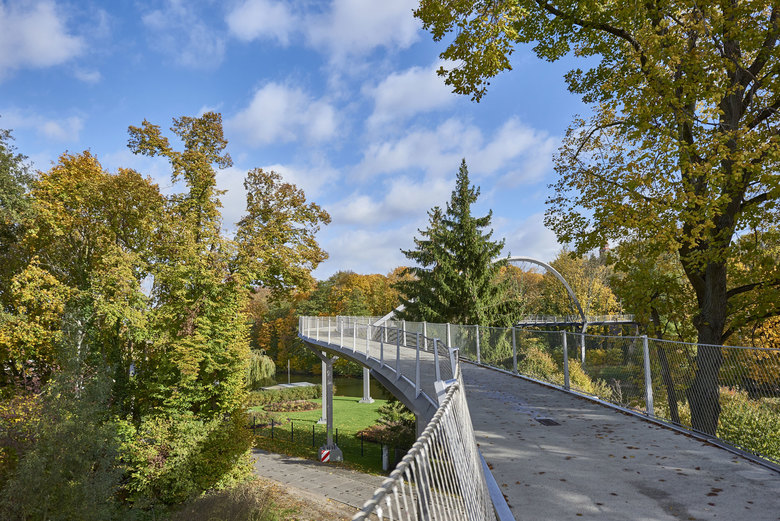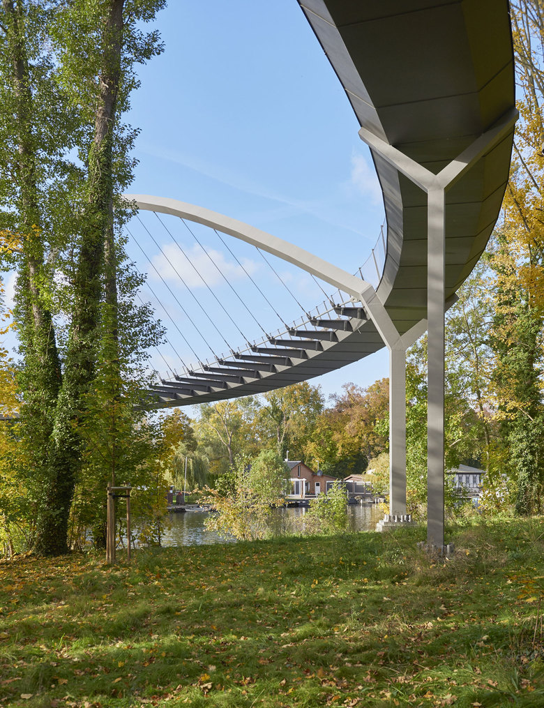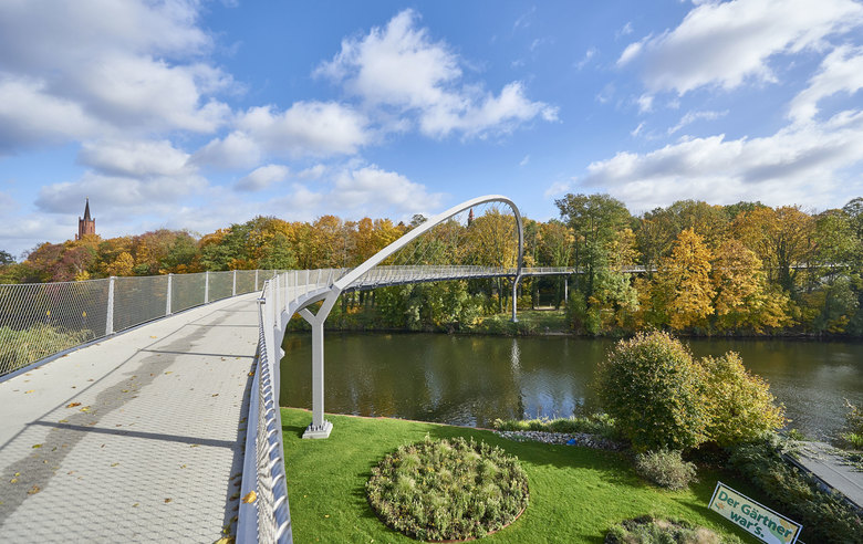The 350-metres-long curved arch pedestrian bridge Weinberg crosses the Havel River to connect the Weinberg Park and the Optik Park, offering pedestrians a pleasant crossing in a beautiful garden landscape and views of the river.