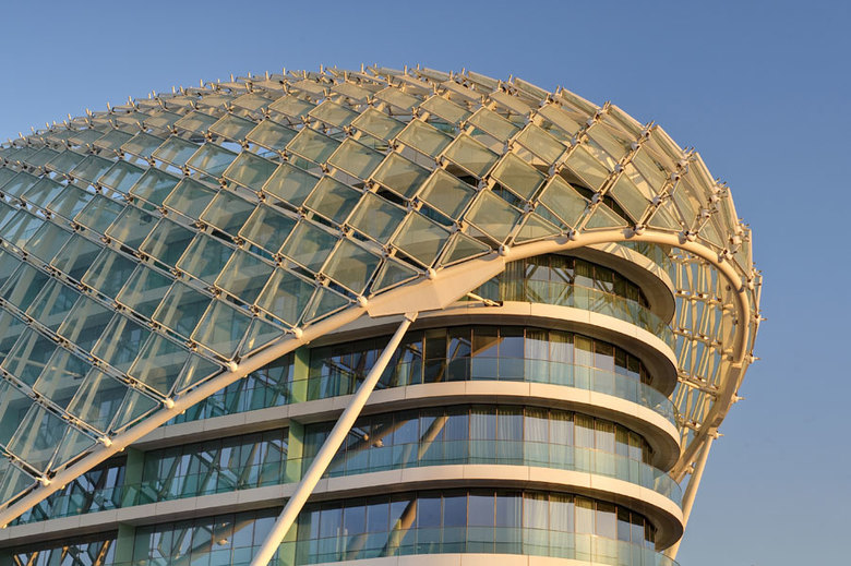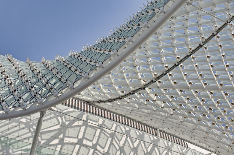 Yas Hotel is a five star signature Hotel next to the Formula 1 racetrack on Yas Island. The iconic glazed veil visually connects two buildings located on both sides of the racetrack. Its structural system is a grid shell that consists of the triangulated mega structure and the quadrangular grid. The free flowing grid shell is structurally one piece without any expansion joints and is supported vertically by 10 V-shaped columns. Due to its size and extreme temperature changes, the grid shell must be able to slide under temperature movements. Therefore eight out of ten supports are able to slide in one direction, with the other two acting as fixed supports. Wind loads are transferred to the concrete hotel structure by horizontal struts. It is covered by 5800 pivoting diamond-shaped glass panels and features LED lighting at each node that allow for programmed lighting and image sequences over the whole surface.