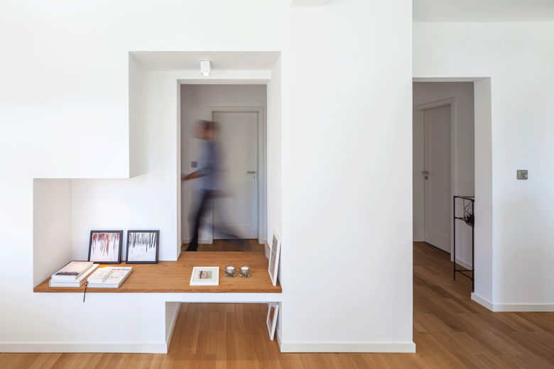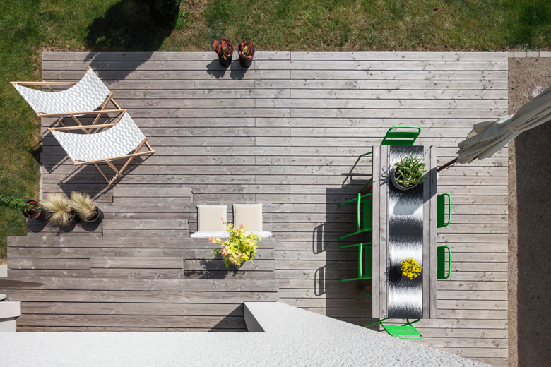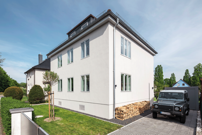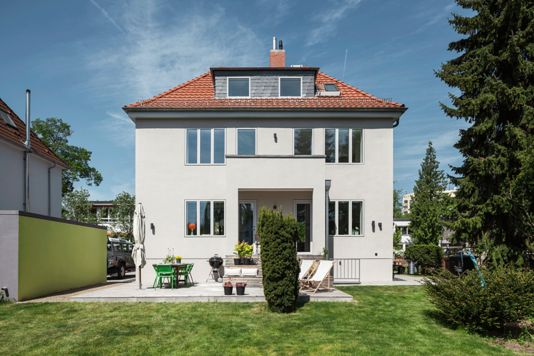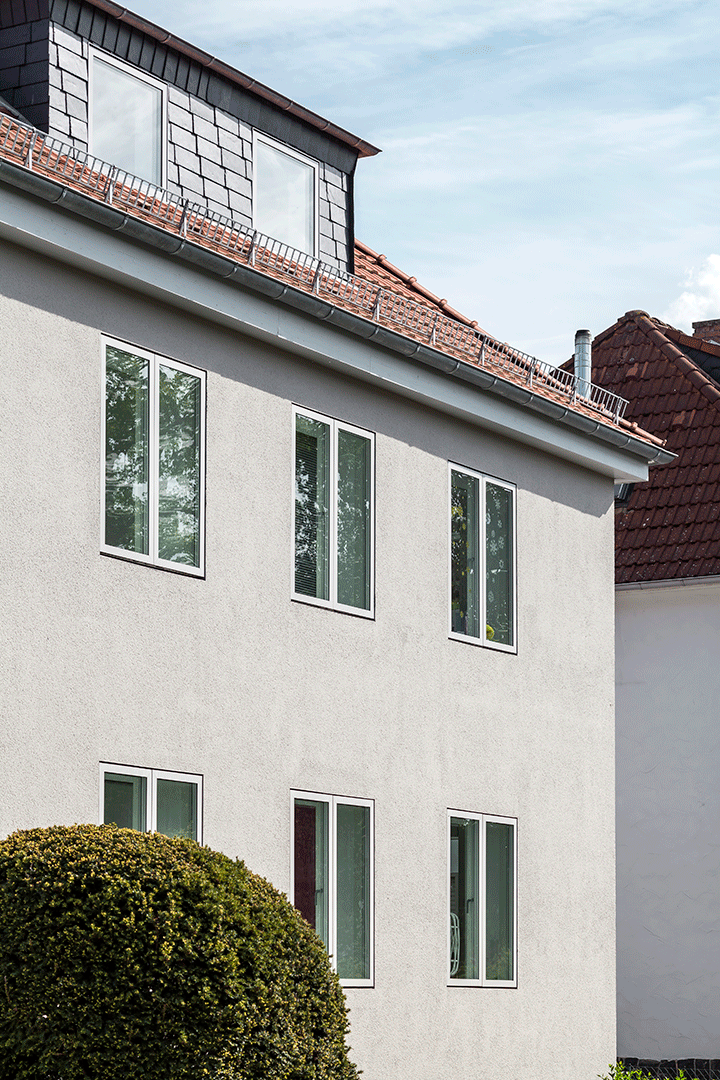 In the Process of reorganizing the inside floorplan and upgrading the top floor, a dormer was added on the side facing the street. To lower the energy consumption a ventilation system as well as a tube collector were installed. The windows are positioned in the in the facade, open to the outside are triple glazed and have an inside sun protection, this strengthens the cubature of the building. A newly planned wooden patio makes the redesigned garden behind the house accessible from the living/dining area.