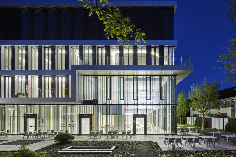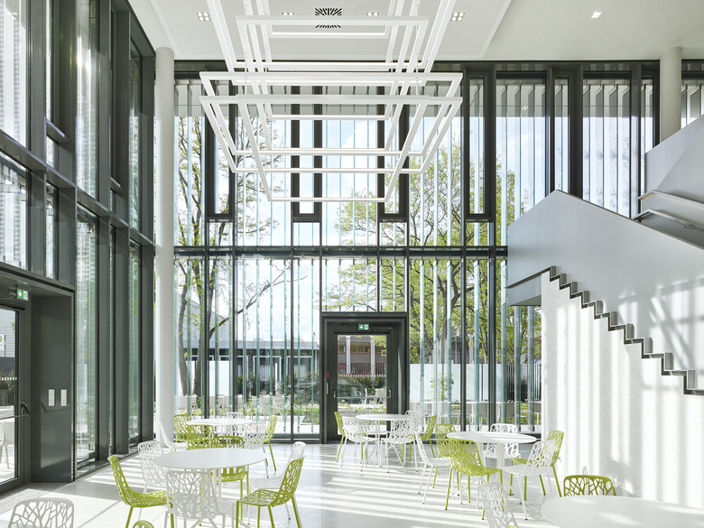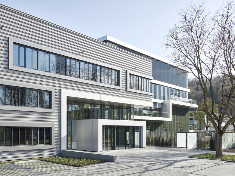 Projektbeschreibung: Erweiterung des Stammsitzes der ERBE Elektromedizin GmbH um eine Betriebsgastronomie, ein Schulungszentrum für Mitarbeitende und Kunden sowie neue Infrastrukturflächen für Verwaltung und Produktion. Dazu gehören ein repräsentatives Eingangsfoyer, Büroräume, Labore, die Räume der Geschäftsleitung, eine Betriebsausstellung mit Lounge sowie Umkleidebereiche für die Mitarbeitenden der Produktion. Der Gesamtkomplex wird gestalterisch als Gebäudecluster begriffen. Es handelt sich um eine Verschränkung von unterschiedlichen Kuben, die jeweils eine andere Fassadenidentität besitzen. Der Neubau stellt funktional den Kopf der gesamten Anlage dar und soll als Abbild eines technischen Unikates die Wiedererkennbarkeit von Bauherr und seinem elektromedizinischen Produkt sein. Er erhält seine Gliederung durch eine Schichtung, in der die einzelnen Funktionen ablesbar sind. Diese Funktionen zeigen sich an der Fassadenoberfläche unterschiedlich profiliert und stellen mit dieser Gliederung einen Übergang zu den angrenzenden Bauteilen her. Durch die funktionale Anbindung des Neubaus an den Bestand wurde die energetische Sanierung der Bestandsgebäudehüllen (Verwaltungsbau und Fertigungshalle) erforderlich. Architektur: Architektur Schmitt Dannien Hofmann Partnerschaftsgesellschaft, Tübingen. Bauherr: Erbe Elektromedizin GmbH, Tübingen. Bruttogeschossfläche: 7.570 m².