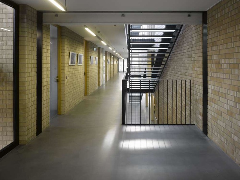 Rathausneubau der Stadt Ebersbach/Fils auf einer Industriebrache unmittelbar neben dem alten, historischen Rathaus. Neubau mit 3 Obergeschossen und einem Untergeschoss. Stahlbetondecken auf nach außen sichtbarem Ziegelmauerwerk aufgelegt.