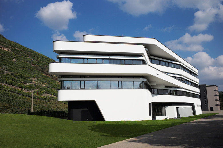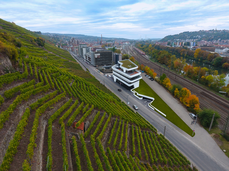 Neubau des Verwaltungsgebäudes für die Südwestmetall-Bezirksgruppe Neckar-Fils. Das Grundstück befindet sich in exponierter Lage am Ortseingang von Esslingen zwischen Bahntrasse, stark frequentierter Ausfallstraße und steiler Hanglage der angrenzenden Weinberge.
