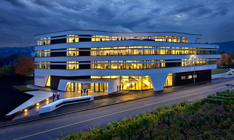 Gebäude als Stahlbeton-Skelettbau. Im Erdgeschoss Seminar- und Vortragsräume, Empfang, Foyer und Meeting Points. In den beiden Obergeschossen transparent verglaste Büroräume entlang den Fassaden nach Osten, Westen und Süden.