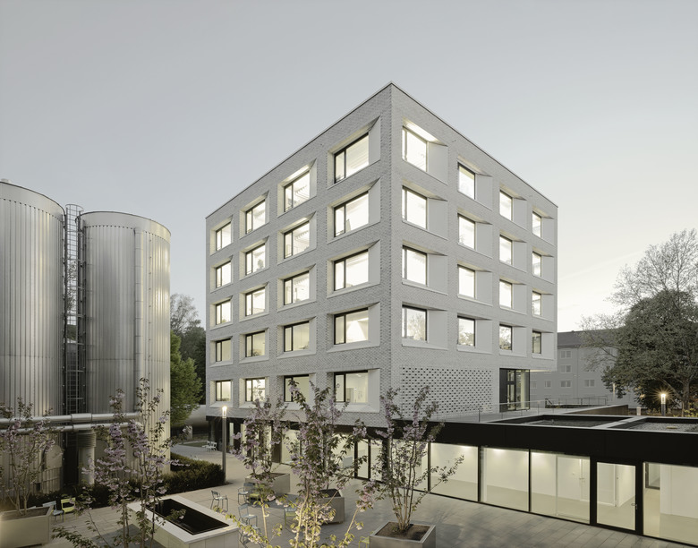Nutzung des Neubaus als Bürogebäude mit flexibel nutzbarem Foyer/Kundenzentrum (EG), stützenfreien Flächen für Einzel- oder Großraumbüros, Kundenzentrum, Lager und Technik sowie Besprechungs- und Schulungsräumen. Verkleidung der Fassade mit Ziegelmauerwerk. Bestandsanbindung des Neubaus über eingeschossigen Verbindungsgang (Stahl-Glas).