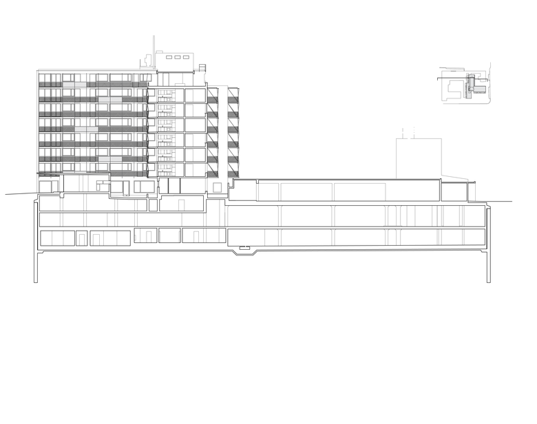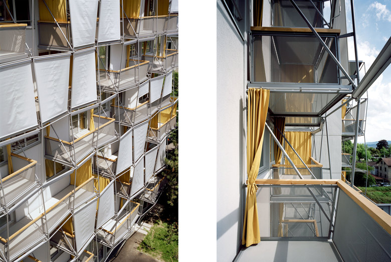 Auch die neue Balkonschicht auf der gegenüberliegenden Seite wird zum mehrfach interpretierbaren Raumgerüst: Jeder Balkon umfasst einen privaten Teil, der mit beweglichen, textilen Elementen vor Sonne und Einblicken geschützt werden kann. Daneben entstehen mehrgeschossig zusammenhängende Bereiche, welche die Belichtung verbessern und Beziehungen zu darüber- oder darunterliegenden Wohnungen eröffnen.