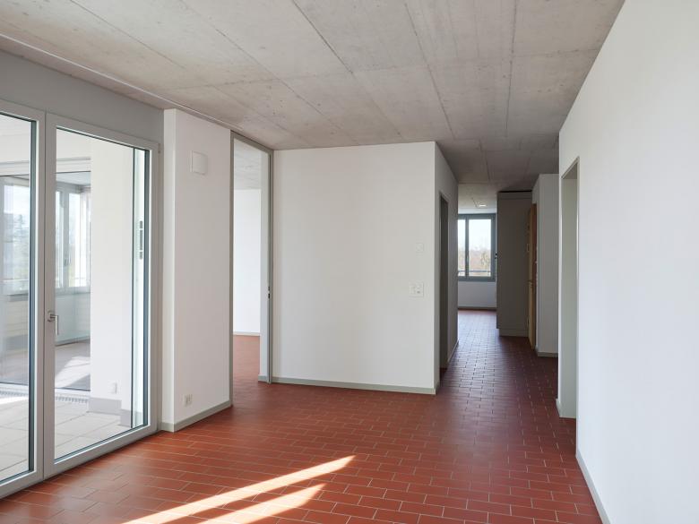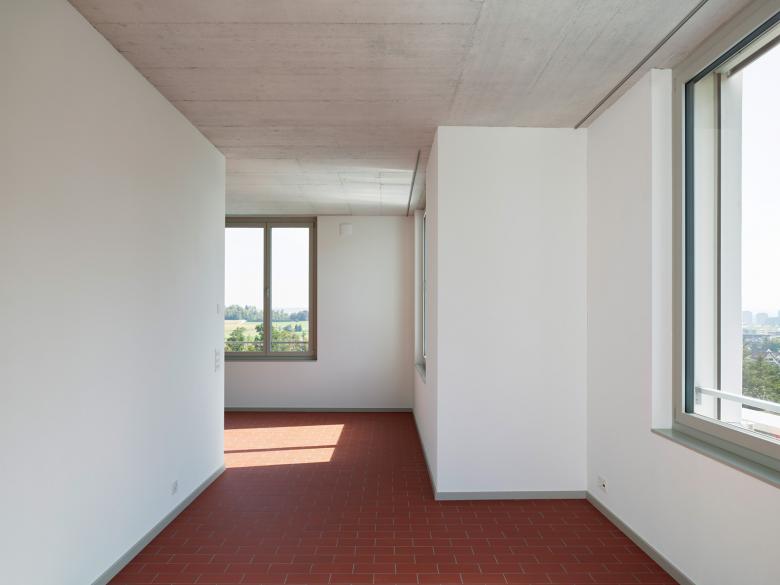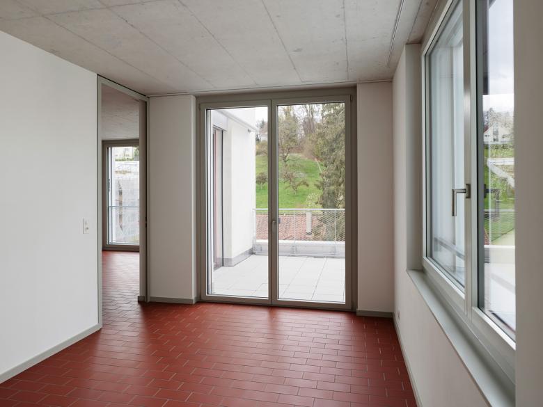 Die privaten Aussenräume sind jeweils gegen Süden auf die ruhige Seite hin orientiert, bei den Zweizimmerwohnungen auf die Westseite. Bei den Zugängen der Wohnhäuser liegen jeweils die Jokerzimmer und die mit Tageslicht versorgten Waschräume.