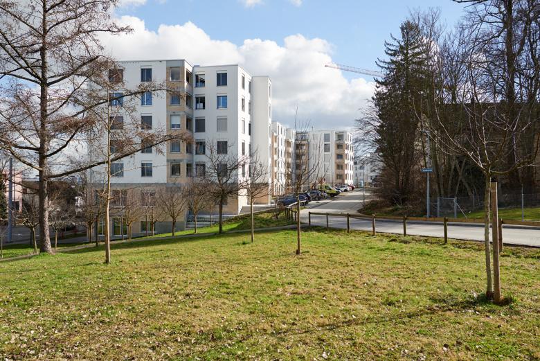 Die gestaffelt terrassierten und ineinander verzahnten Zeilen im zuvor unverbauten Hang passen sich auf natürliche Weise ins steile Gelände ein. Die Länge der beiden Gebäude verweist städtebaulich einerseits auf die zweiflüglige Anlage des Schulhauses, andererseits entsteht durch die Gebäudeversprünge eine kleinteilige Proportionierung, welche sich an den entlang der Geländekrete aufgereihten Einfamilienhäuser orientiert. Die Staffelung und die versetzte Struktur wird sodann als Thema auch bei den beiden an der Wehntalerstrasse gelegenen Gebäude aufgenommen und springt beim Quartierplatz Obsthalde auf diese über. Die Dimensionen und Proportionen werden dabei der Lage an der Wehntalerstrasse entsprechend angepasst und mutieren zum Typus des städtischen Hauses an der Strasse.