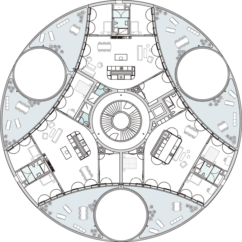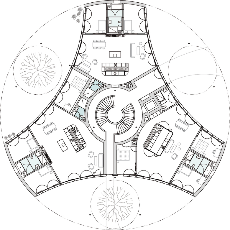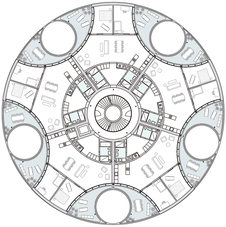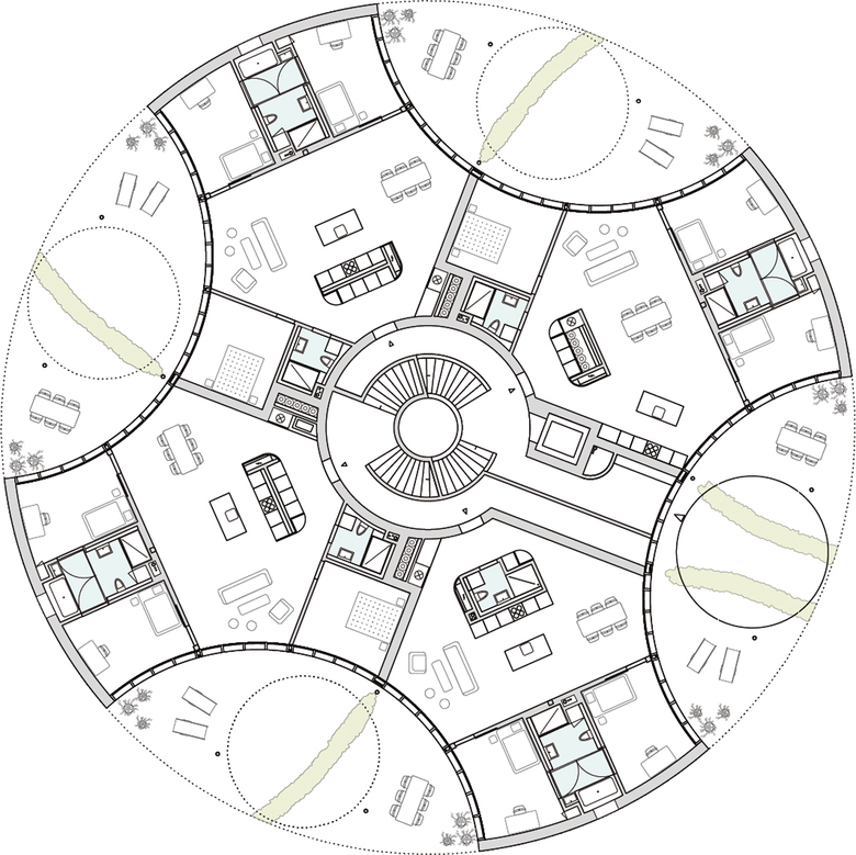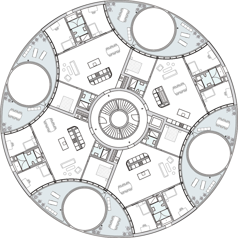 Der jeweils gleiche Kreisumfang erhält durch die unterschiedliche Anzahl von runden Auskerbungen verschiedene Gebäudetypologien: es entstehen Drei-, Vier- und Fünfspänner mit unterschiedlichen Wohnungsgrundrissen. Dabei enthalten die Dreispänner die mit 4 1/2 und 5 1/2 Zimmern grössten Wohnungen, die Vierspänner mit 4 1/2 Zimmern die mittleren und die Fünfspänner mit 3 1/2 Zimmern die kleinsten. Diese Differenzierung geht einher mit der jeweiligen Gebäudehöhe, sodass die Fünfspänner zwei- resp. dreigeschossig sind, die Vierspänner weisen fünf Geschosse auf und die Dreispänner haben acht Geschosse. Die Auskerbungen bilden grosszügige Terrassen, welche jeweils mittig durch eine Leerstelle unterteilt sind. Die durchgehenden Wohnräume besitzen damit auf beiden Seiten je einen Terrassenteil.