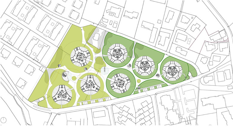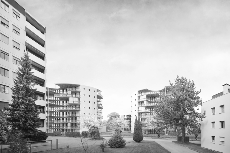 Von niedrigen Häusern mit zwei Geschossen erfolgt eine Staffelung der Höhe bis zu achtgeschossigen Häusern. Diese Höhenentwicklung folgt einerseits dem Geländeverlauf und reagiert andererseits auf die Gebäudehöhen der Umgebung. Sie kulminiert am höchsten Punkt mit den zwei hohen Häusern, welche sich zum bestehenden Hochhaus gesellen und zu diesem in Dialog treten. Die freie Verteilung der Gebäude auf dem Grundstück erzeugt eine hohe Durchlässigkeit. Ein feinmaschiges Wegenetz unterstützt den Raumfluss und erlaubt vielfältige Anknüpfungspunkte an bestehende Wege und Landschaftsräume und vervollständigt die übergeordneten Wegbeziehungen.