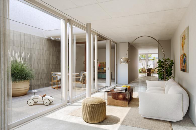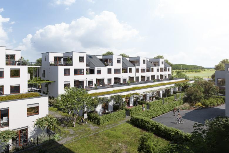 Die Lage der Wohnhäuser bietet keine grandiosen Ausblicke in die Landschaft. Der Entwurf der Wohnungen richtet deshalb das Augenmerk auf eine enge Verschränkung der Innenräume mit dem eigenen privaten Aussenraum. Die Erdgeschosswohnungen erhalten einen besonders reichhaltigen Austausch mit verschiedenen Aussenräumen: ein kühler nordseitig gelegener Vorhof, ein innenliegender Patio und ein südlicher Vorgarten mit südländisch anmutender Pergola. Die Kleinwohnungen im 1. Obergeschoss verfügen über eine grosszügige Terrasse. Die 3 ½-Zimmer-Duplexwohnungen besitzen zwei abgetreppt angeordnete ‚Hofterrassen‘ und die 4 ½-Zimmer-Duplexwohnungen eine grosse, dreiseitig umschlossene Terrasse im Wohngeschoss. Die unterschiedlichen Wohnungsgrössen und Wohntypologien lassen eine bunt gemischte Bewohnerschaft erwarten.