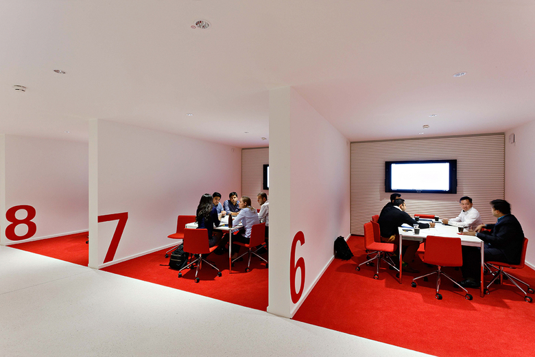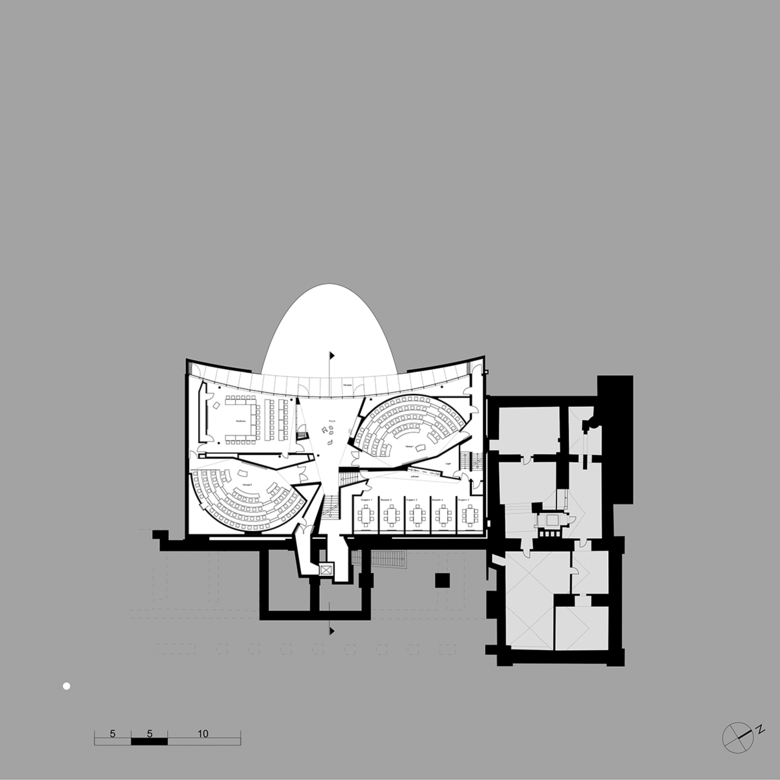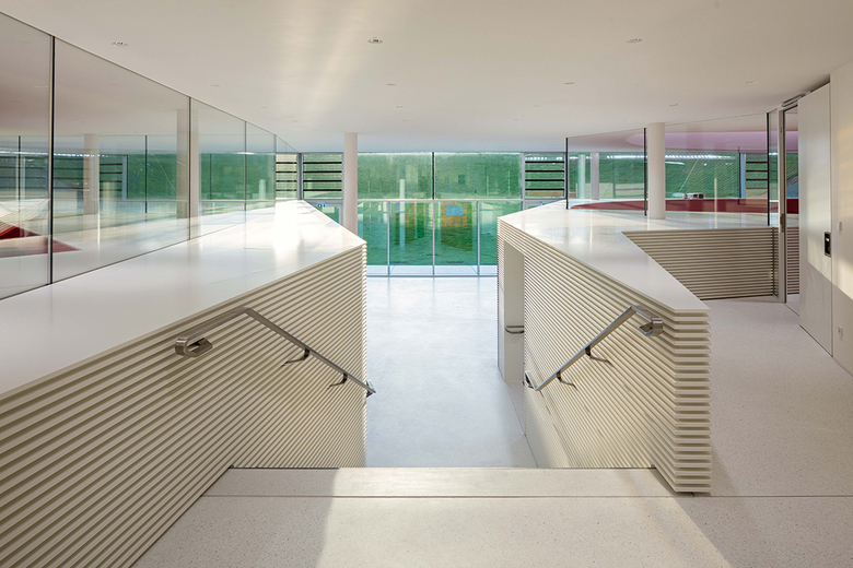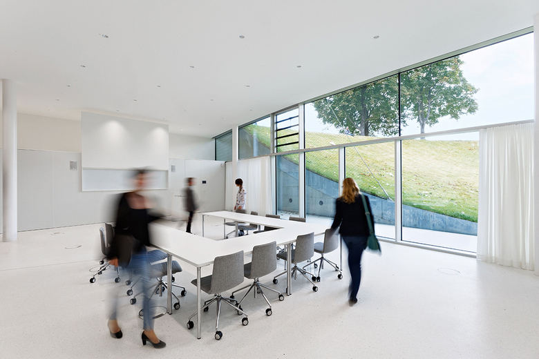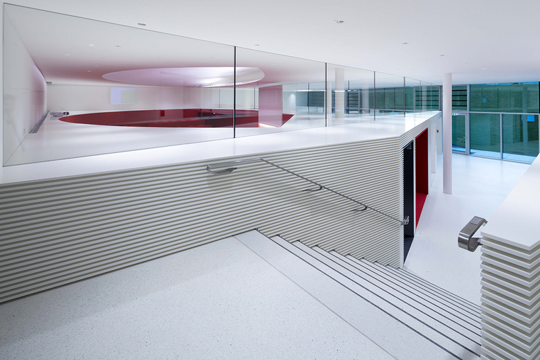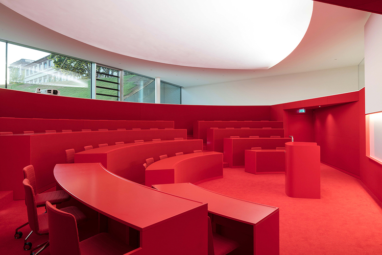 The semi-circular lecture theatres are accentuated with a cambered ceiling to increase the sense of openness. The doors and carpeting, right through to the desks and chairs are all coloured red – in contrast, and as a complementary colour, to the green of the castle garden. Each lecture theatre is designed for up to 60 persons, with raked rows of seating, so that those seated in the last row still have the impression of being close to the lectern. The conference room – which can be flexibly configured using sliding doors – and the forum, serving as an additional common area, both lie adjacent to the glazed frontage overlooking the castle garden. The ten break-out rooms are designed as open niches to the right of the staircase – five rooms located a few steps below the lecture rooms and a further five above, arranged along a gallery from which there is a view over the lecture rooms to the exterior.