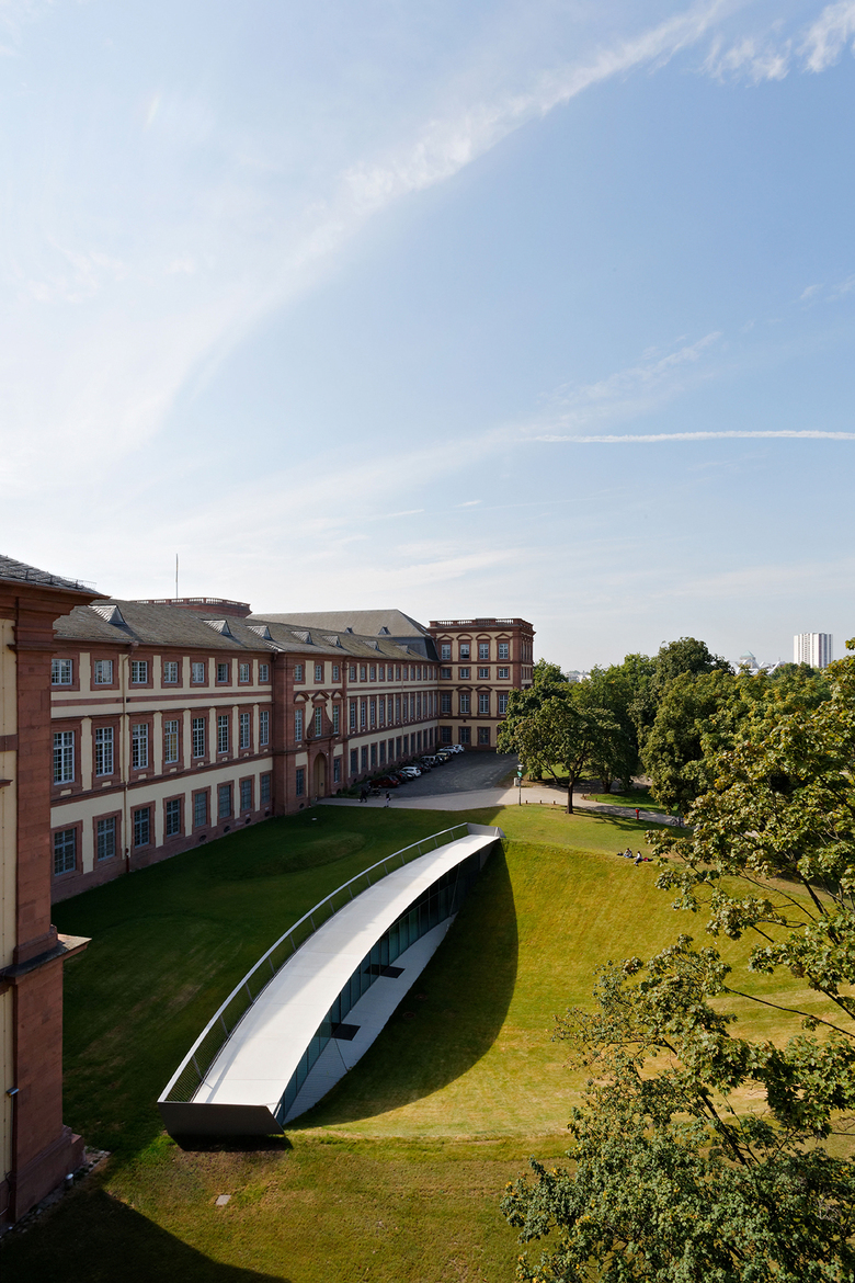 In Europe’s second largest baroque castle schneider+schumacher has just completed a modern study and conference centre for Mannheim Business School. Dug into the garden, the new intervention and the historic building together now form a remarkable unity that symbolizes not just the desire to safeguard tradition, but to value innovation too.
