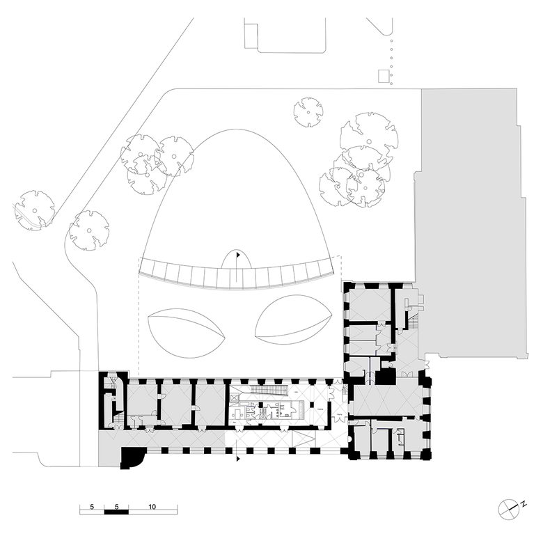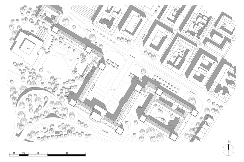 The new lecture complex is accessed from the Ehrenhof via the former castle kitchen. From here, a lift and a generous staircase lead down into the double-height extension below ground. A forum opens onto two lecture rooms, a conference room, and ten so- called ‘break-out rooms’. A wide glass frontage opens up the campus to the castle garden, which dips down at this point, like an ancient Greek theatre. The green landscaping is intended to be used by students and it extends over the roof, which is also accessible.