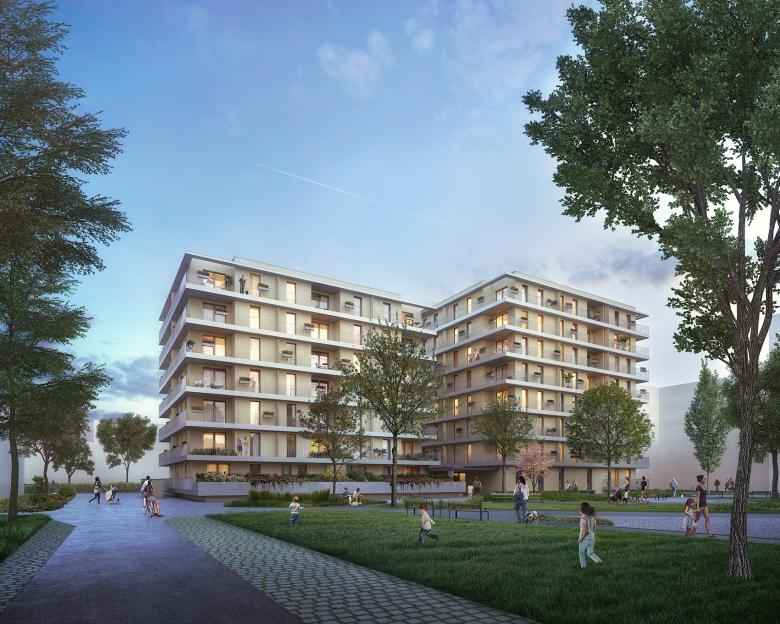 Kompakte und hochfunktionale Grundrisse, deren Wohnzimmer und Freiflächen überwiegend an den Gebäudeecken angeordnet sind, verfügen über einen sehr hohen Wohnwert, der durch die umlaufenden Balkone noch gesteigert wird. Französische Fenster(-türen) bieten eine optimale Tagesbelichtung aller Wohnräume. Die Eigenverschattung der umlaufenden Kragplatten sorgt zusätzlich für thermische Behaglichkeit im Hochsommer. Alle Wohnungen haben ‚kurze Wege‘ und sind bereits ‚anpassbar‘ konzipiert. Sie bieten den BewohnerInnen ein Gefühl der Offenheit und Großzügigkeit bei gleichzeitig maximaler Wahrung der individuellen Privatsphäre.