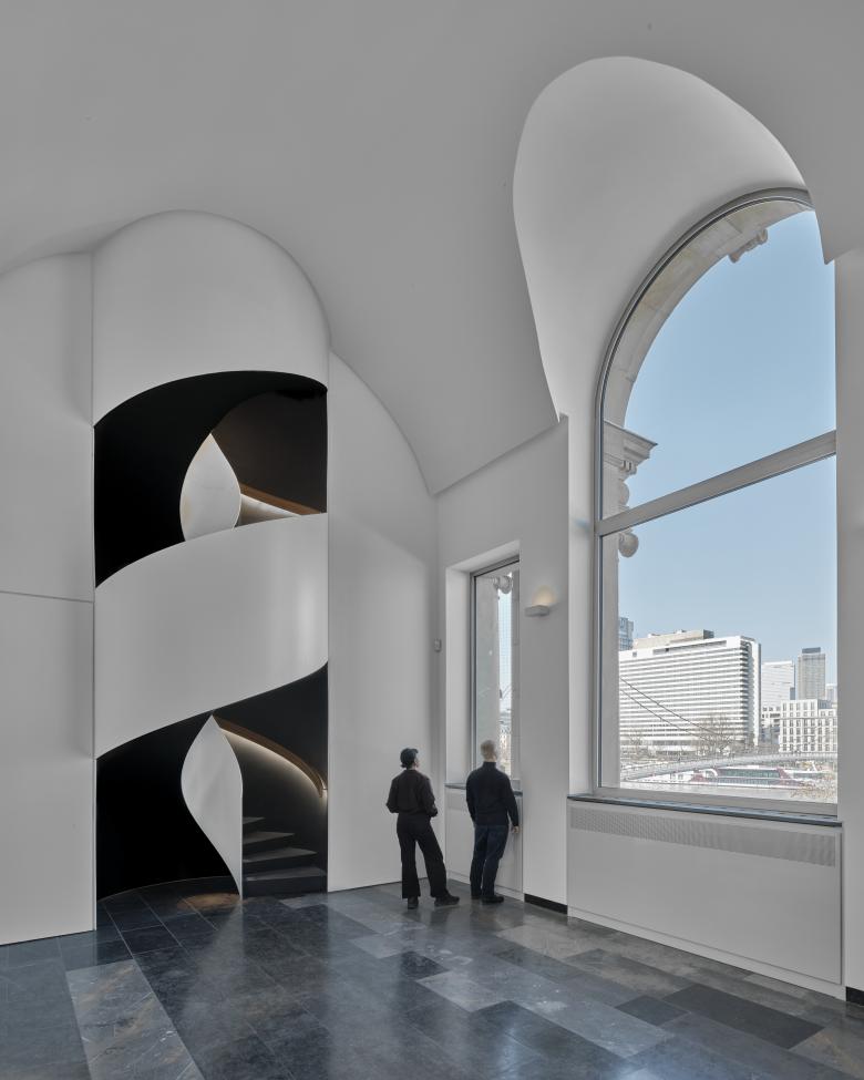 Eingefügt wurden zwei stählerne, zylindrische Spindeltreppen mit jeweils 50 Stufen, die je zwölf Meter hoch sind und eine Verbindung zwischen Alt und Neu schaffen.