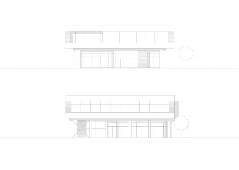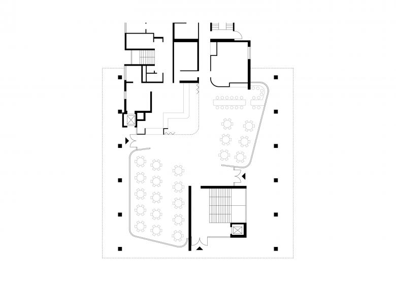 Das sowohl funktional als auch gestalterisch in die Jahre gekommene Gebäude wurde im Gastbereich komplett neu gedacht, um mehr Sitzplätze sowie mehr Nutzungsflexibilität zu ermöglichen. Dazu wurde der Gastraum der Cafeteria im Erdgeschoss abgerissen und unter der später errichteten Kantine im Obergeschoss eine neue freie Cafélandschaft eingefügt, die sich mit Rundungen vom Bestand formal löst.