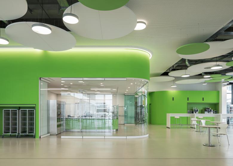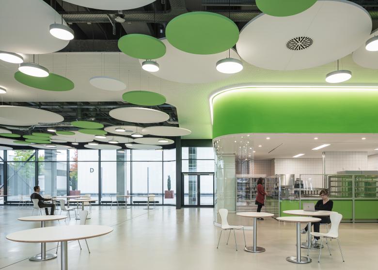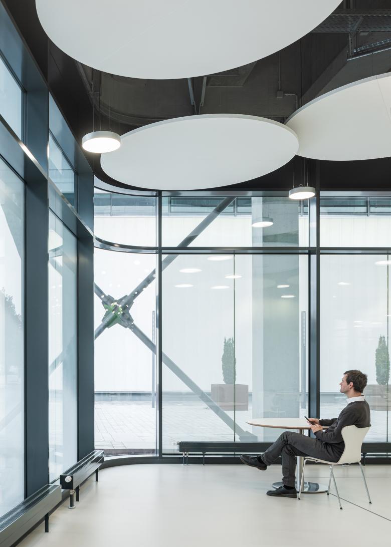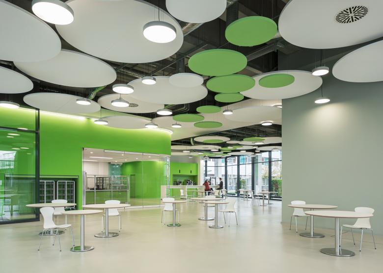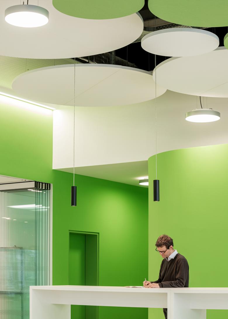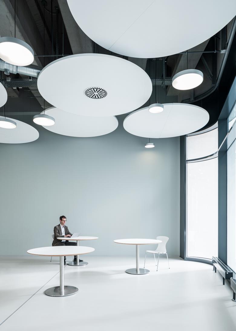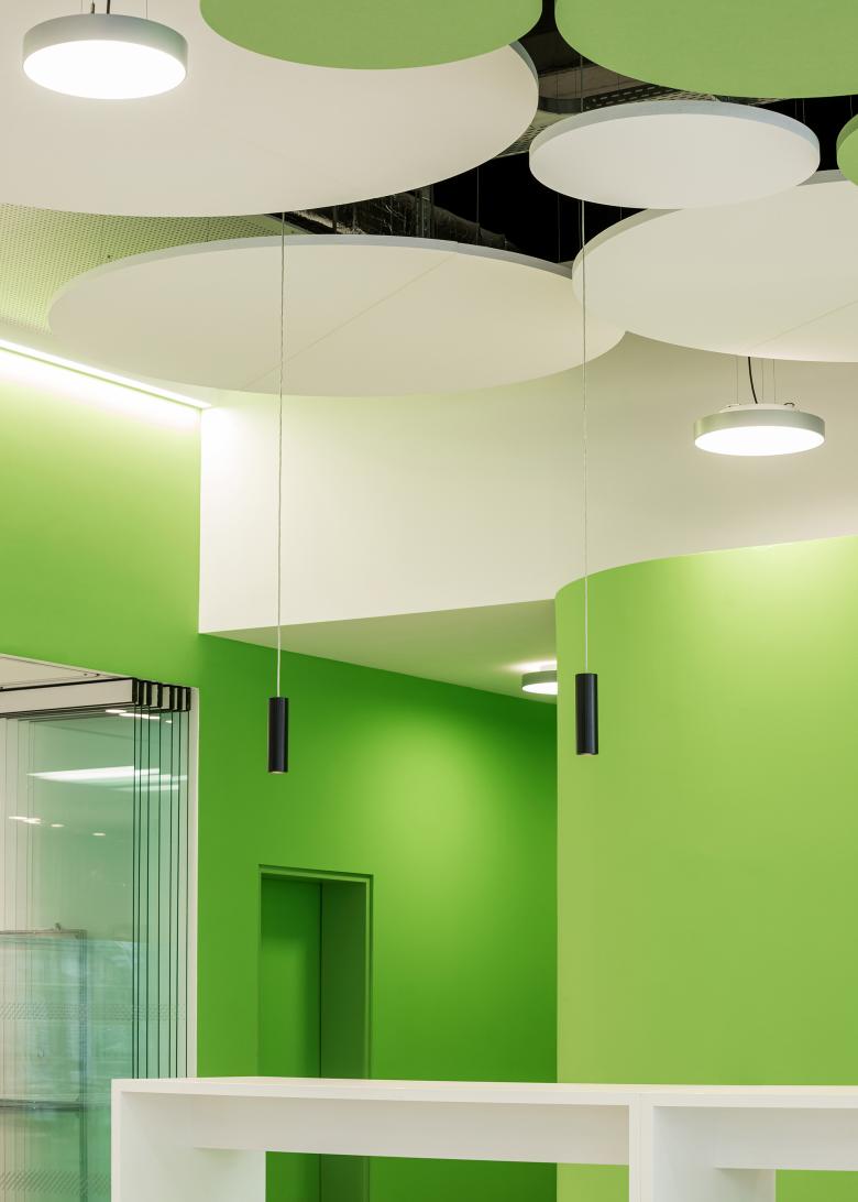 Die differenzierten Raumzonen werden durch runde Akustiksegel formal verbunden. Die Elemente in unterschiedlichen Durchmessern sind in verschiedenen Höhen von der Decke abgehängt und bilden einen artifiziellen Himmel, an dem sich weiße und grüne Elemente abwechseln und farbige Frische in den Raum bringen.
