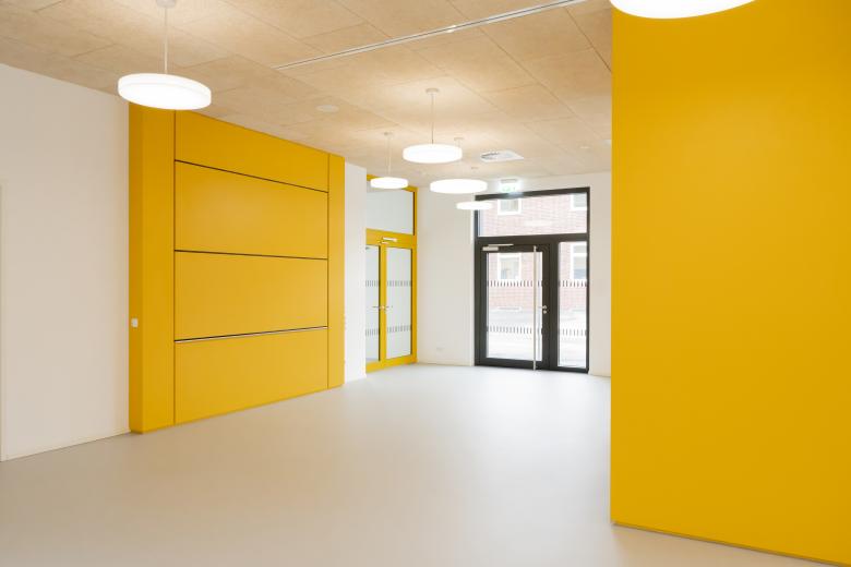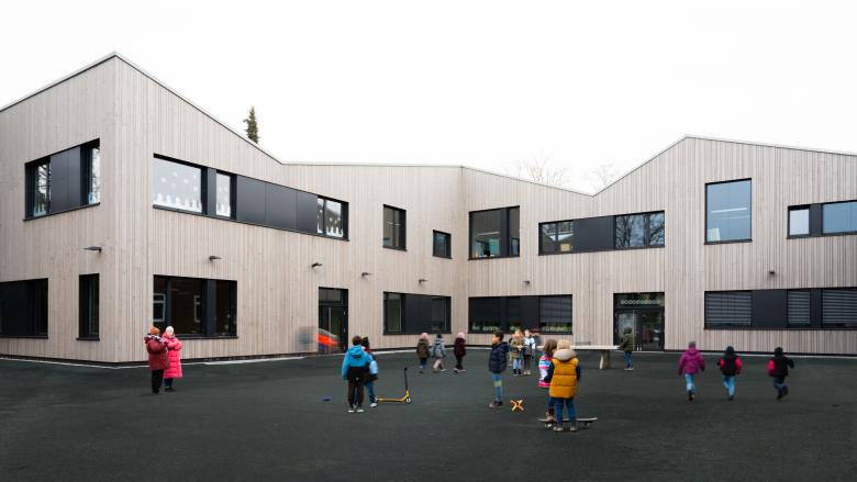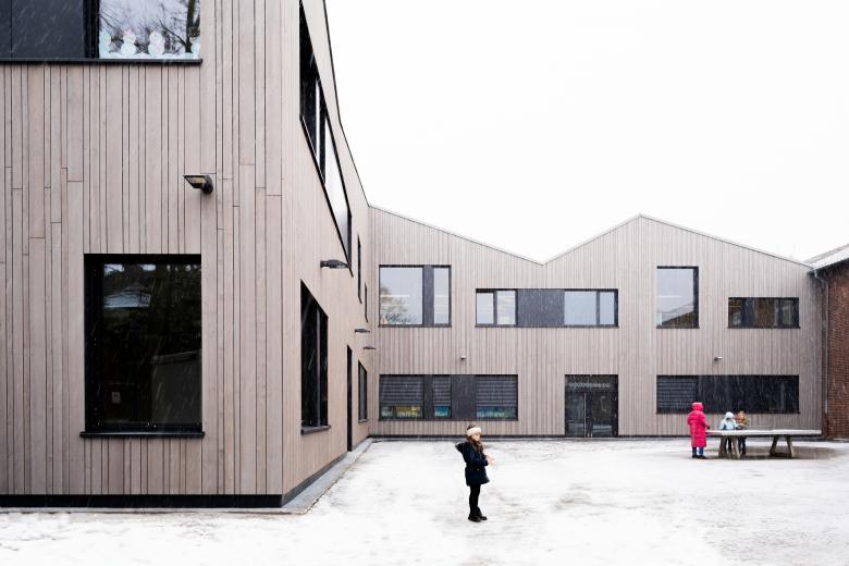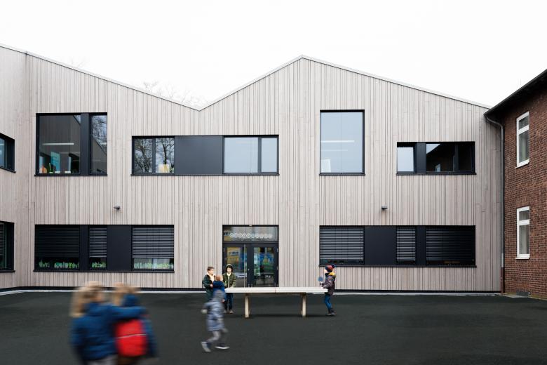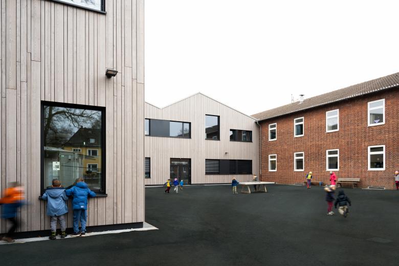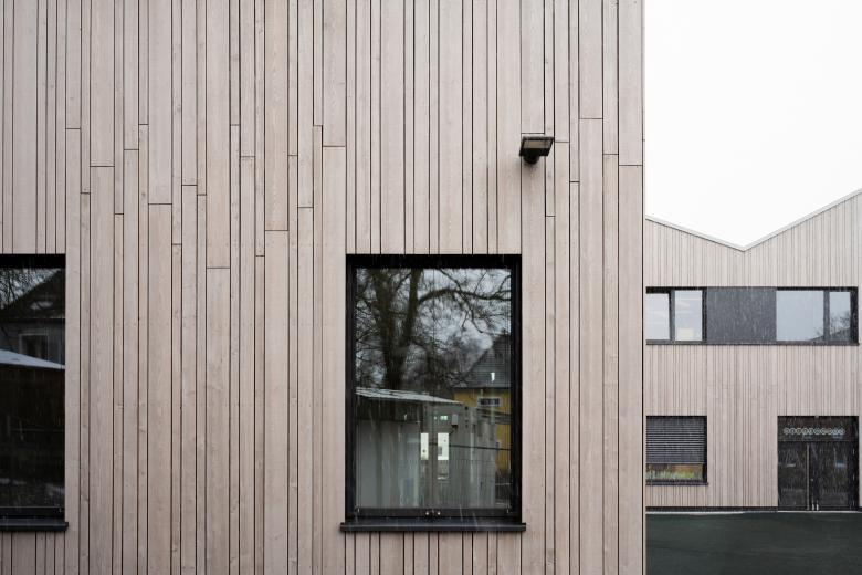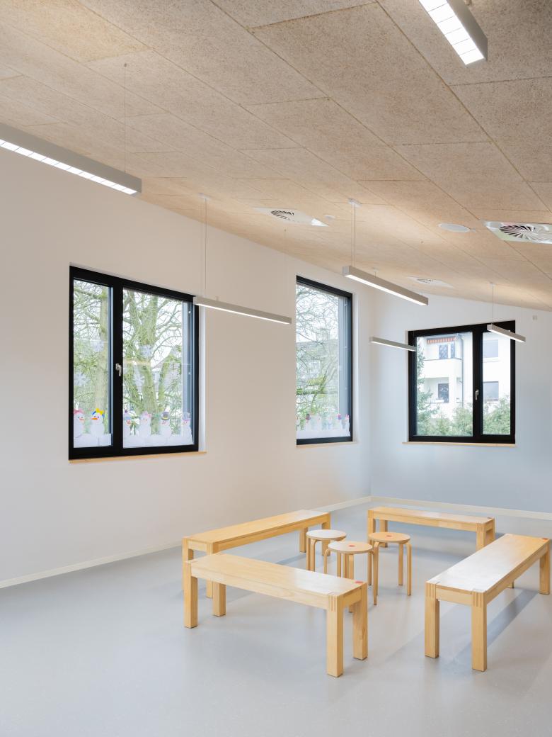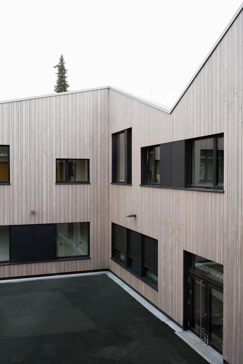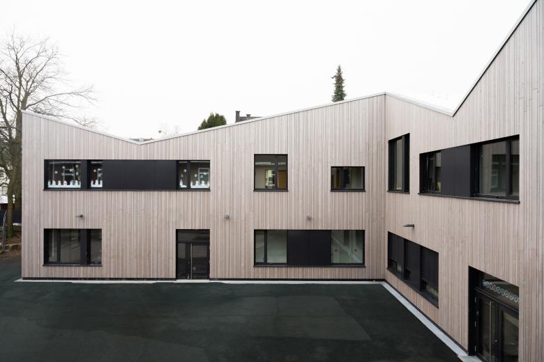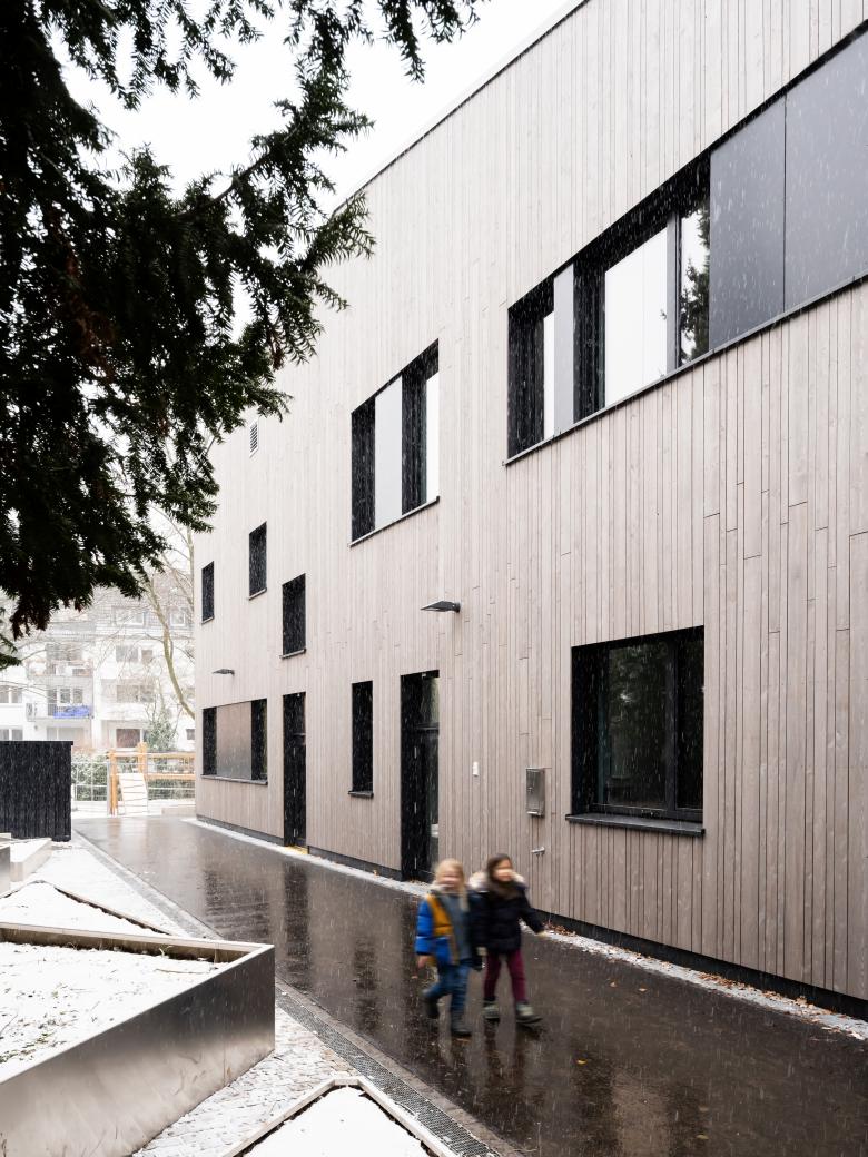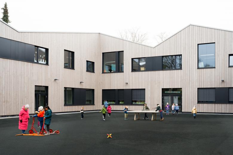 Sehw Architektur setzte konsequent auf eine Holzsystembauweise, um ökologischen Aspekten Rechnung zu tragen und gleichzeitig eine ästhetisch ansprechende Gestaltung zu ermöglichen. Das Volumen mit seiner charakteristischen Dachlandschaft, seiner vertikalen Holzschalung als Gebäudehülle und den frei komponierten Fensteröffnungen verleiht dem Gebäude eine kraftvoll-spielerische Optik. Bei der Material- und Farbwahl wurden weitestgehend natürliche und warme Oberflächen und Töne eingesetzt. Kräftige Farben sollen die Kinder selbst ins Haus bringen. Einzige Ausnahme ist ein kräftiges Gelb bei den Türen zur Akzentuierung und Orientierung.