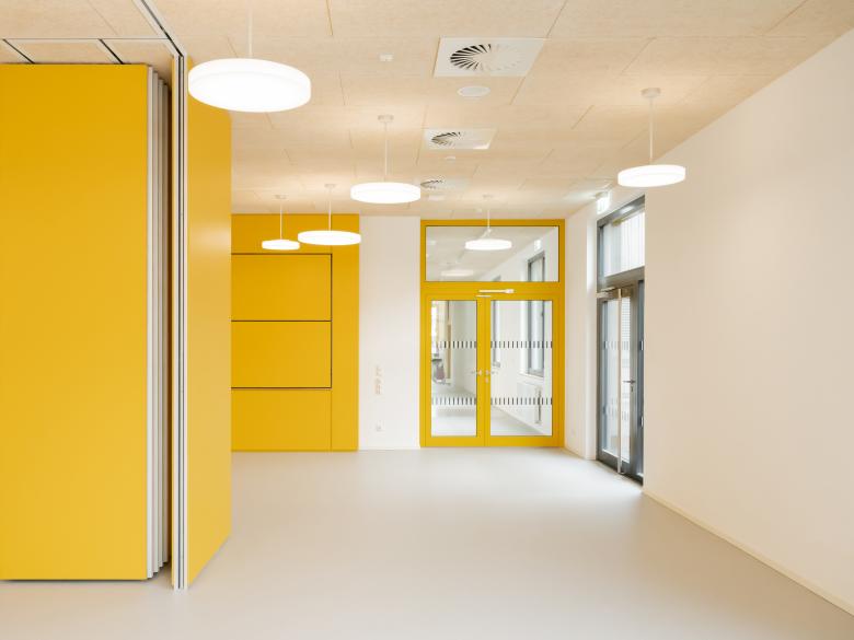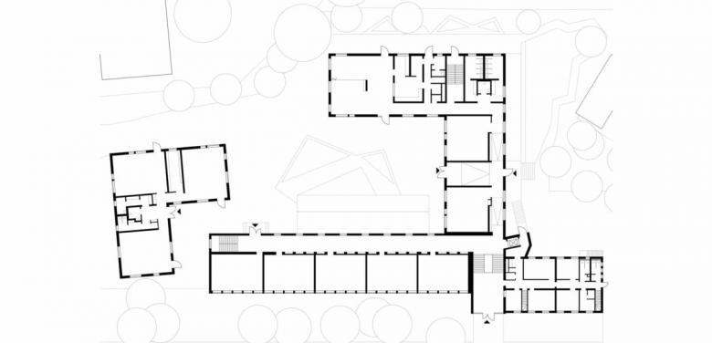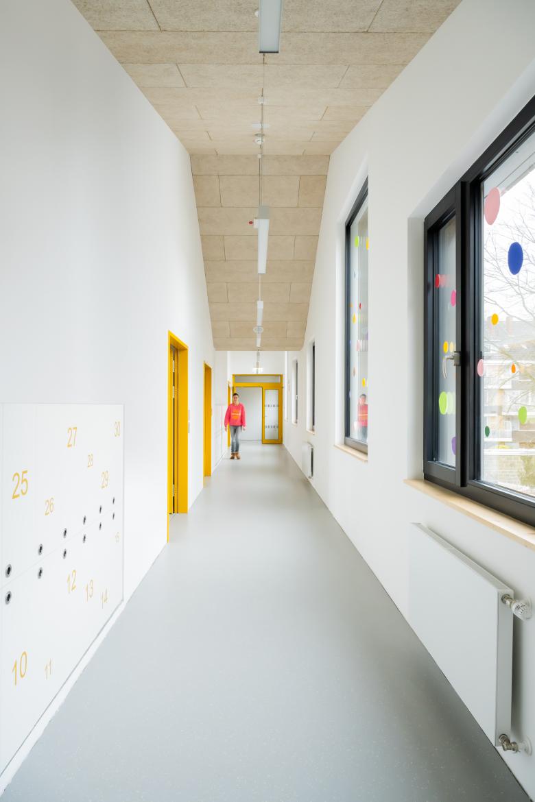 Die L-förmigen Grundrisse der Neubauten spannen mehrere zusammenhängende Freibereiche auf, die entsprechend programmatisch gestaltet wurden als Schulgarten, Pausenhof, Bewegungsfläche, etc. Zu den Schulhöfen orientiert wurden im Grundriss die Bewegungszonen zugeordnet. Damit entsteht Frequenz, entsteht Sichtbarkeit und Kommunikation. Die Klassen- und sonstigen Funktionsräume wurden zum fokussierten Lernen zur ruhigeren Seite hin orientiert. Durch die unterschiedlich großen und unterschiedlich gesetzten Fenster gelangt Tageslicht tief ins Innere der Räume und trägt zum Wohlfühleffekt bei.
