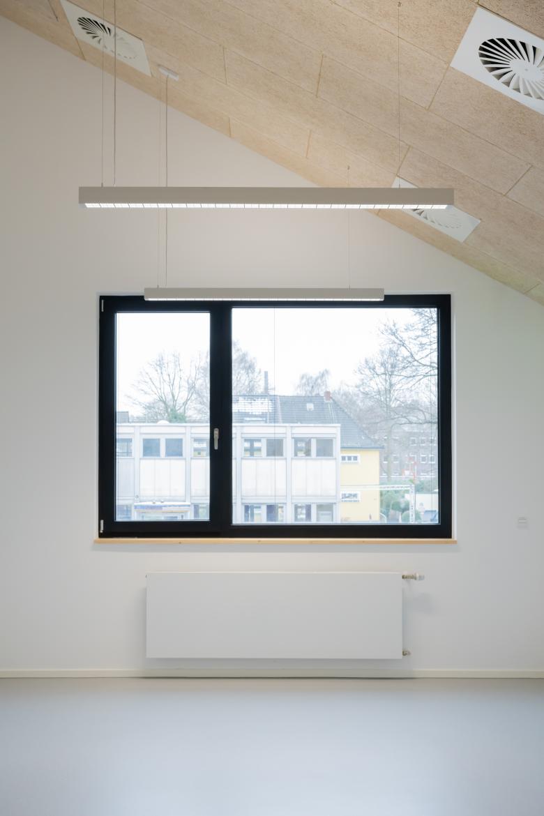 Keine leichte Bauaufgabe stellte sich den Architekt*innen. Es galt zwei in die Jahre gekommene Bestandsgebäude aus den Fünfziger Jahren zu sanieren und durch mehrere Neubauvolumen zu einem gesamtheitlichen Ensemble zu verbinden. Ziel war es, eine zeitgemäße und pädagogisch inspirierende Lehr- und Lernumgebung zu schaffen, die den modernen Anforderungen an Bildungseinrichtungen entspricht. Das neu entstandene „Lerndorf“ mitten in der Stadtmit seinen vier Gebäuden schafft genau das. Der Holzneubau auf dem bestehenden Schulcampus vermittelt in seiner Gestaltung zwischen der Bestandsbebauung und dem Neubau, indem er die Satteldächer der Nachkriegsmoderne weiterbaut und in eine Landschaft aus geneigten Dachflächen überführt.