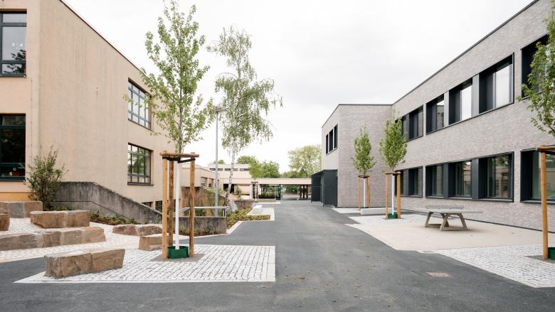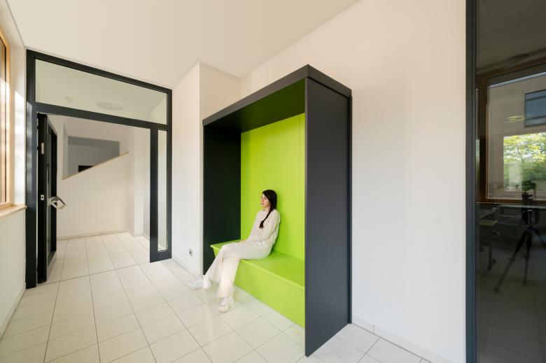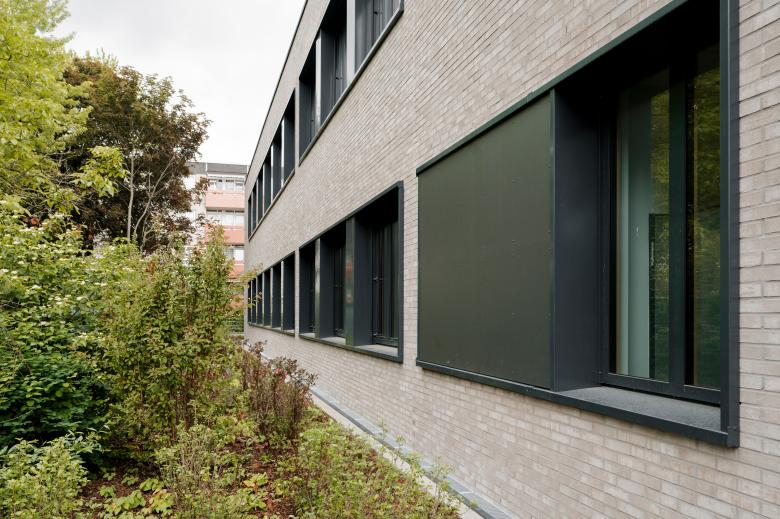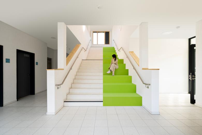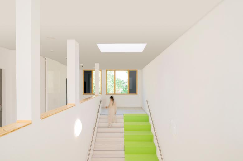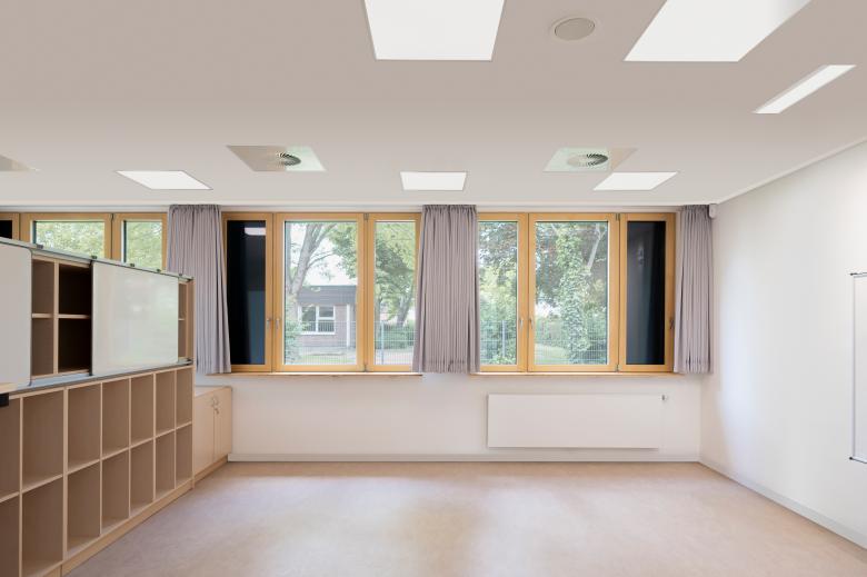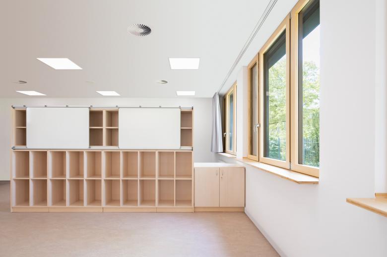 Klare horizontale Akzente bestimmen die Fassadengestaltung. Das gilt für die Klinkerfassade mit ihren Fugen ebenso wie für die liegenden, langen Fensterelemente. So entsteht trotz des konsequenten Gestaltungsrasters, das sich aus der Modulbauweise ergibt, eine gewisse Leichtigkeit. Die Ausgewogenheit von Transparenz und Opazität bietet ein optimales Verhältnis von Tageslicht, sommerlichem Wärmeschutz und solaren Gewinnen. Fensterbänder und Pfosten-Riegel-Konstruktionen im Eingangsbereich ermöglichen die Kommunikation zwischen innen und außen, schaffen Orte der Begegnung und Gemeinschaft. Um lange monotone Flure zu vermeiden, werden diese durch Rücksprünge im Bereich der Differenzierungsräume aufgeweitet und mit Tageslicht sowie Sitznischen für die Schüler*innen im gleichen frischen Grünton wie auf der Haupttreppe versorgt. Vor den Klassen entstehen so angenehme Kommunikationsbereiche und Orte des informellen Lernens. Die Klassenräume sind zurückhaltend neutral und hell gestaltet. So wird das Tageslicht optimal genutzt, aber auch eine ruhige Arbeits- und Lernatmosphäre geschaffen, die als Leinwand für kreative Entfaltung dient. Diese Schulerweiterung ist ganz im Sinne moderner wissenschaftlicher Erkenntnisse ein dritter Pädagoge.