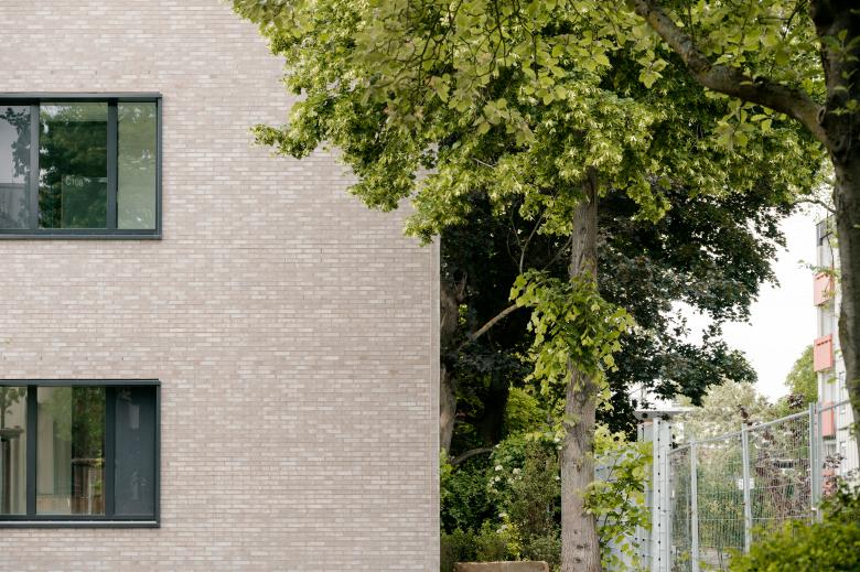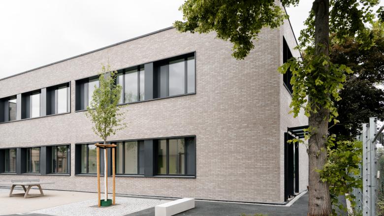 Lernen in Lindweiler – Der Erweiterungsbau der Gemeinschaftsgrundschule Köln-Lindweiler, einer Offenen Ganztagsschule, wurde in neunmonatiger Bauzeit in Holzmodulbauweise errichtet. Neun Klassen können nun an diesem Standort unterrichtet werden. Der kompakte zweigeschossige Baukörper mit heller Klinkerfassade und langgestreckten Holz-Aluminium-Fensterelementen reagiert mit ruhiger und klarer Geometrie auf das bestehende Schulgebäude. Der Eingang des Erweiterungsbaus orientiert sich zum Bestandsbau und schafft einen gemeinsamen, gefassten Vorplatz. Betritt man das verglaste Foyer des Erweiterungsbaus, wird man von einer offenen, zweigeschossigen Schulhalle empfangen, die auch als repräsentatives Forum für Schulveranstaltungen dient. Die großzügige Treppenanlage aus Geh- und Sitzstufen ist vertikale Erschließung und pädagogischer Ort zugleich und setzt mit den grünen Sitzstufen einen frischen Akzent.