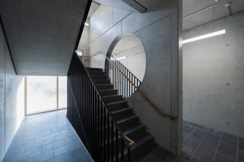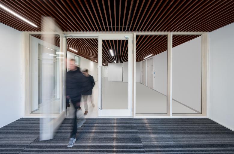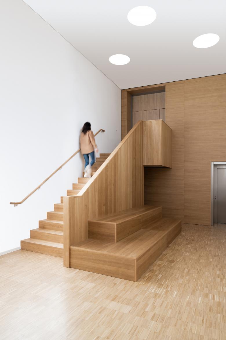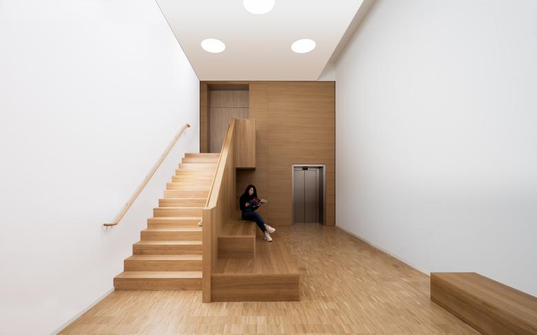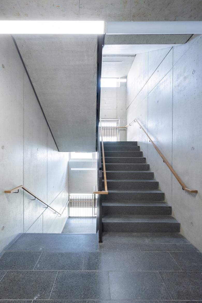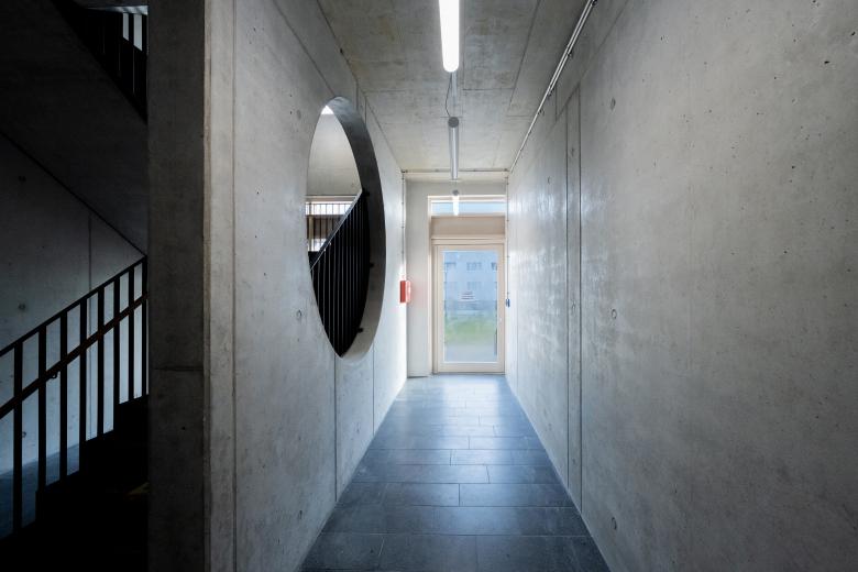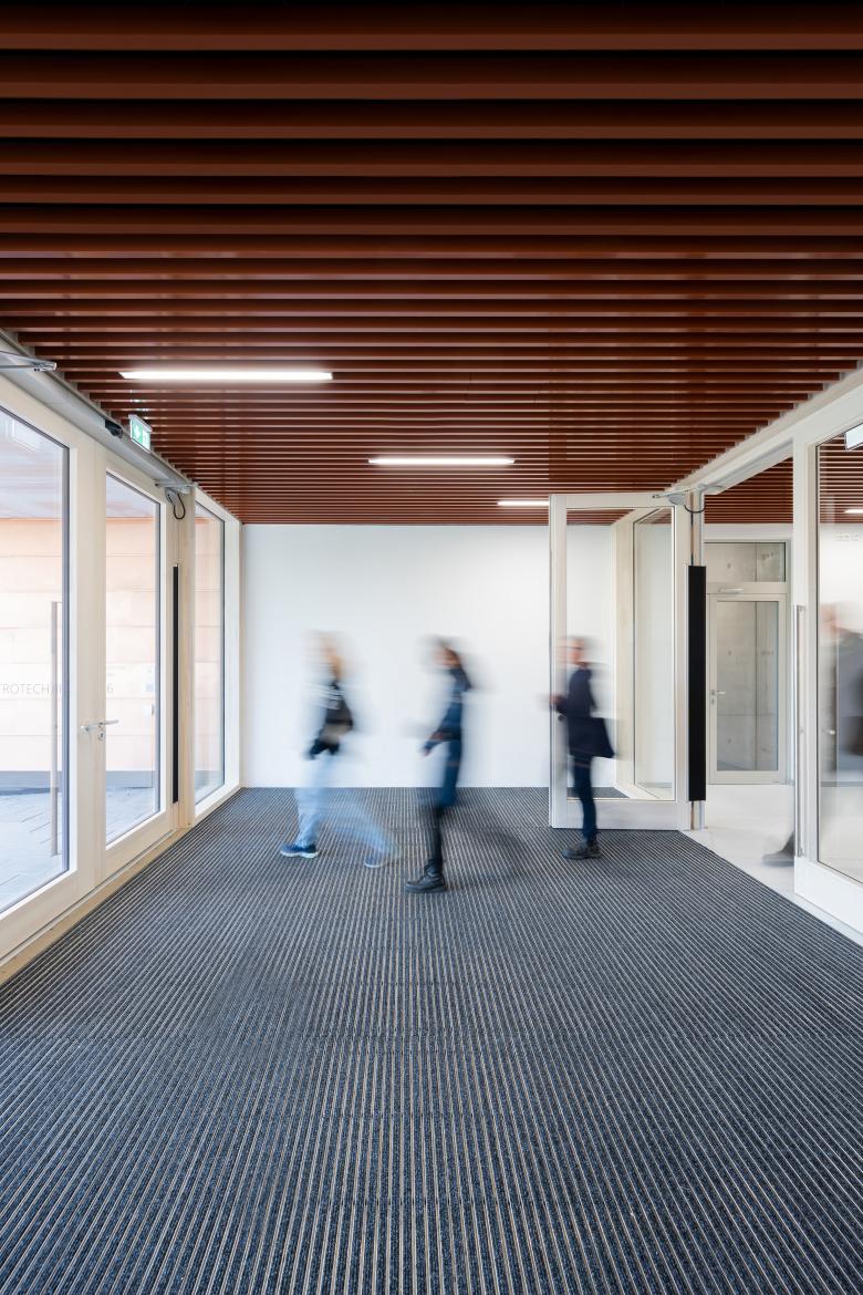 Der Gebäudeeingang erfolgt direkt von der Campusachse mit einem Unterschnitt im Volumen. Der Neubau empfängt den Besucher mit einem weiten und lichten Foyer, von dem man in die oberen Stockwerke oder in den Hörsaal gelangt. Im Erdgeschoss befindet sich neben dem Hörsaal hauptsächlich die Verwaltung der Institute. Der Hörsaal dockt direkt im Eingangsbereich seitlich an den langen Riegel an und wird durch seine Betonfassade in seiner Sonderfunktion betont. Die oberen Stockwerke teilen sich die Institute. Dadurch entsteht eine klare Zonierung in Bereiche mit viel Studierendenverkehr und Bereiche für konzentrierte Forschungsarbeit, ohne aber die Durchlässigkeit und Kommunikation zwischen den Instituten zu behindern. Die Stockwerke sind als einfache, robuste Mittelfluranlage konzipiert mit einer schmalen Raumspange für Büronutzung und einer tiefen Raumspange für Seminarräume, Labore und Werkstätten. Zwischendurch werden gezielt Fluraufweitungen gesetzt für soziale Interaktion und informelle Gespräche.