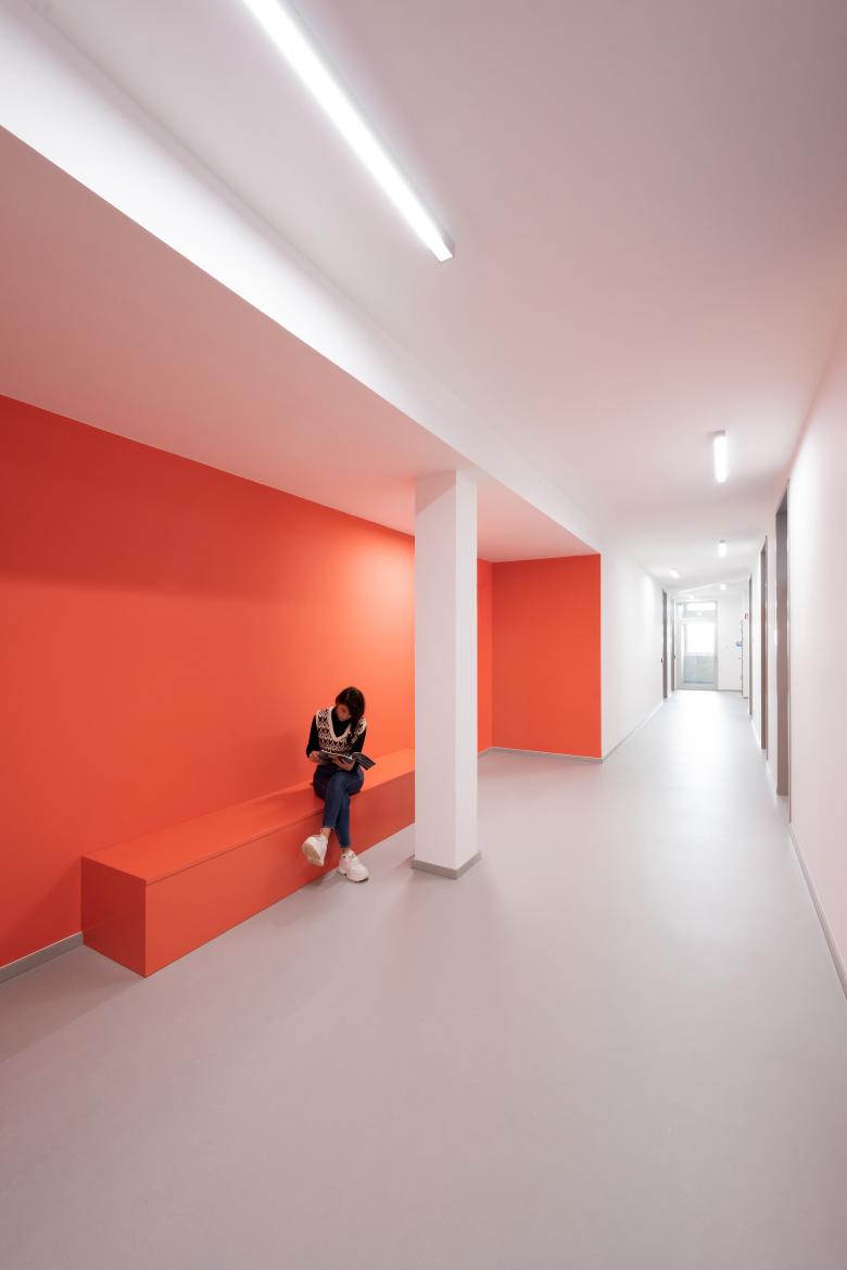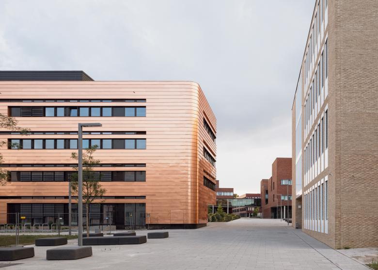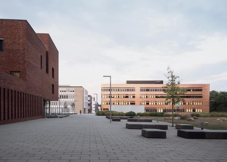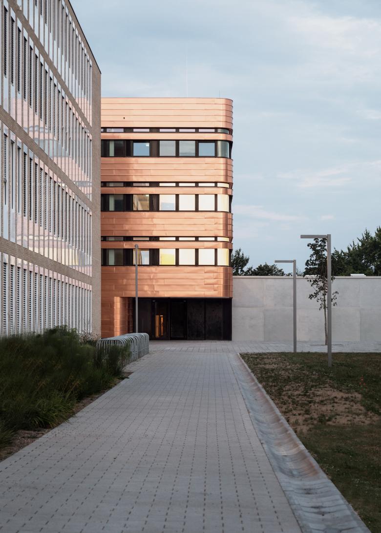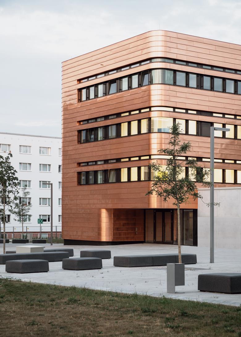Um ein gesamtheitliches Ensemble zu schaffen, reiht sich die Hülle des Gebäudes in die Rottöne der umgebenden Gebäude ein und schafft gleichzeitig durch die Materialwahl einen starken eigenen Akzent. Der Masterplan für den Campus bestimmt Lage und Kubatur des Gebäudes. Es entsteht ein klarer Riegel mit einem Annex für den Hörsaal. Zur optimalen Belichtung der tiefen Seminar- und Laborräume mit Tageslicht wurde eine Fassade mit zweigeteilten Fensterbändern entwickelt. Das untere Band lenkt Licht auf den Arbeitstisch und lässt Blicke nach draußen zu, das obere schmalere Band lenkt Tageslicht tief ins Gebäudeinnere.