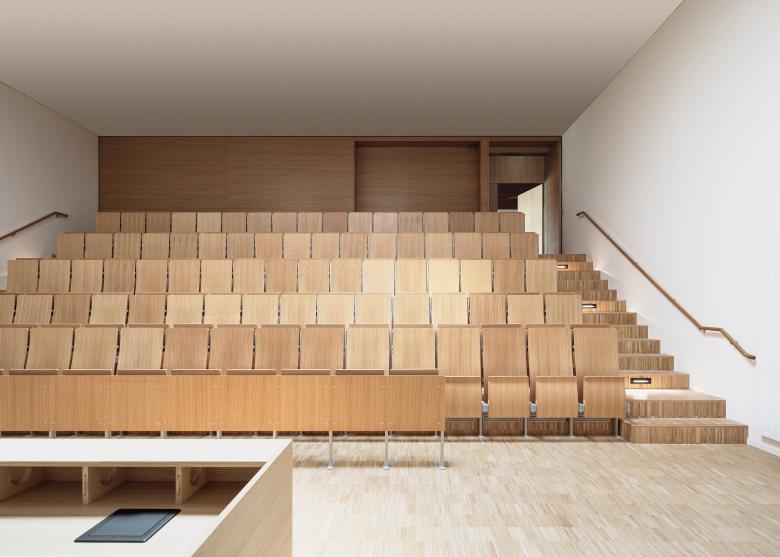 Das gestalterische Konzept spielt mit Gegensatzpaaren bei Farben und Materialien: kühl und metallisch, warm und holzig, kupferrotbraun und erdig, grau und schwarz. Der metallisch glänzenden kupferrotbraunen Fassade des Gebäudes wird der graue Sichtbetonkubus des Hörsaals eingeschrieben. Im Innern präsentiert sich das Gebäude mit neutralen weißen Oberflächen, akzentuiert werden die Fluraufweitungen durch eine kräftige Farbgebung in rot, der Hörsaal mit Oberflächen aus Eichenholz, die Treppenhäuser durch sichtbaren Beton.