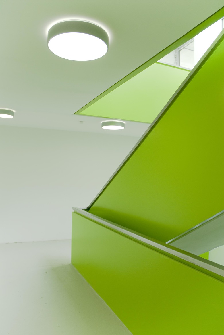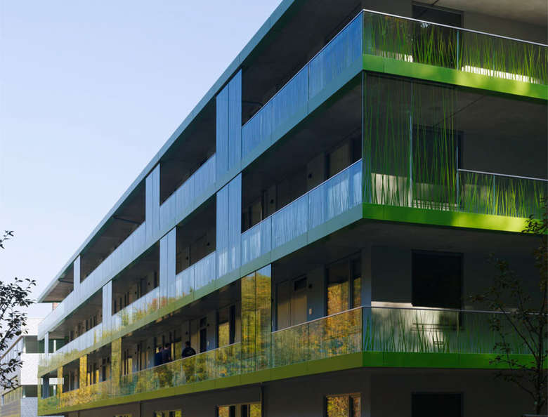 Due to its green tone, the façade radiates freshness and friendliness. Colors also set strong accents in the apartments. Through the interplay of glass, plaster, and exposed concrete, the material design combines smooth and rough surfaces that provide a varied haptic experience.