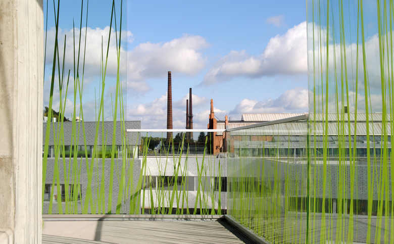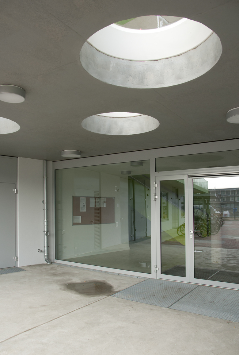 The overhanging arcade was surrounded with a light dress of printed panes of glass that are partially floor-to-ceiling and partially parapet-high, thereby breaking with the negative connotations of the arcade type. The print shows enormous blades of grass and lets the access areas seem like calmer, semi-private spaces without separating them from the surroundings and darkening them.