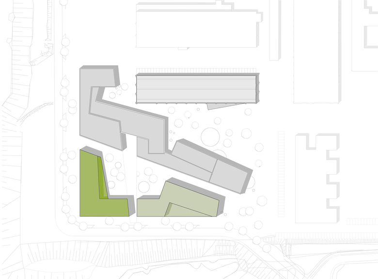 The design for the ensemble follows a strong urban planning concept that determines the forms of the buildings. The architecture breaks with the historical-orthogonal composition and enables new lines of sight and pathways between the buildings. It thereby creates lively outdoor spaces with high amenity values. This idea is extended in the interiors where axes narrow and broaden creating streets and squares that function as meeting places.