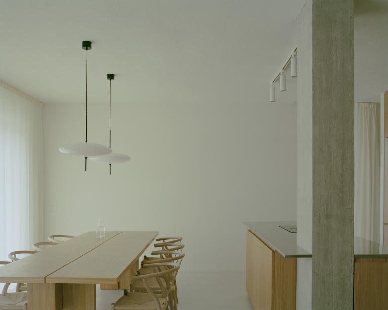 The interior layout favors open, fluid spaces, reducing partitions to a minimum. The living area is conceived as a continuous environment, articulated solely by the service core, which serves as a backdrop for the open kitchen. The existing staircase was freed from its original enclosing walls and reimagined as a sculptural and lightweight element, emphasized by a slender stainless steel handrail.