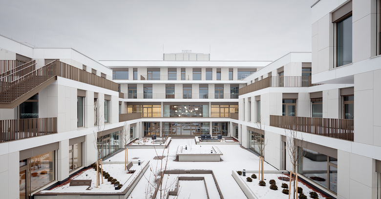 Excerpt from the jury’s protocol: “The historic building will be significantly enhanced by how the design focuses on the main entrance. The new building design dovetails well with the existing structure, especially how the transition from the existing roof top to the new building is addressed. The new design follows the symmetry of the original structure and surrounds a central, spacious courtyard offering high amenity value. The ground floor connects with a corridor to the former riding hall which will now be transformed to a gymnasium and creates a complete complex. The new grandstand adds an extra value for high school sports and school events. The overall accessibility is well arranged and clearly understandable. The relationship of the new development, using the courtyard as a central focus point, was positively perceived by the jury. All work stations feature a direct connection to the outside area. The work stations are clear, simple and lie in the vicinity of the departments of secondary education.The design assures a clear concept that has been implemented consistently and high architectural quality is achieved. The plan emphasizes the good usability of the open space, exterior work stations and other work areas that are easily accessible to other areas within the complex. The total design assures a clear concept that can be implemented."