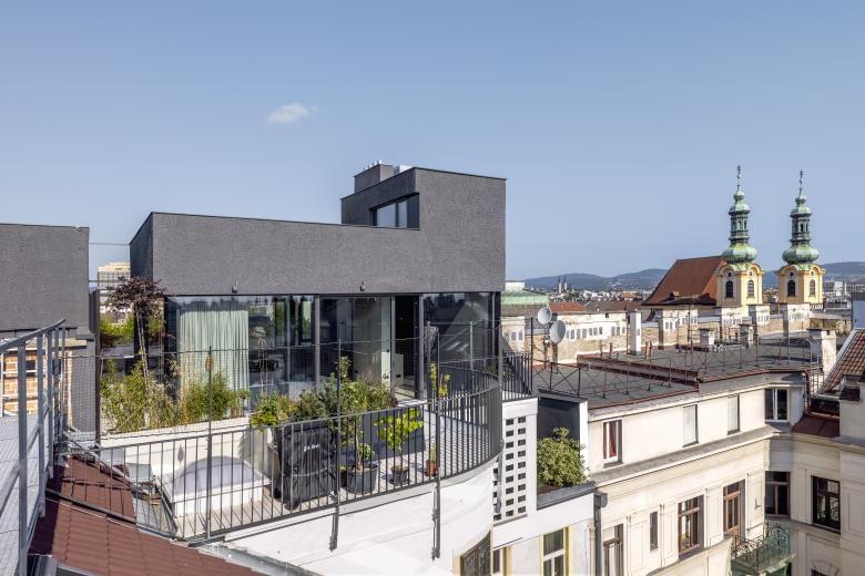 In a Viennese residential building constructed around 1900, two additional separate residential units were to be created in the course of an attic conversion. Our goal for this project was to create as many open spaces and terraces as possible while at the same time ensuring maximum privacy for the two residential units.
