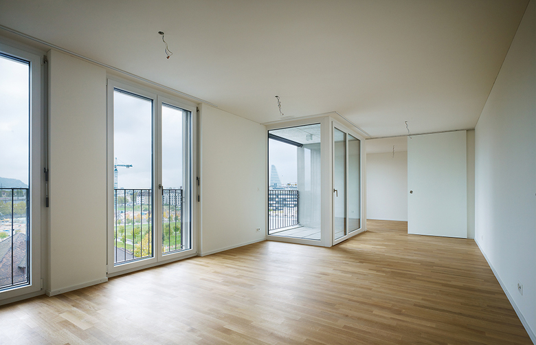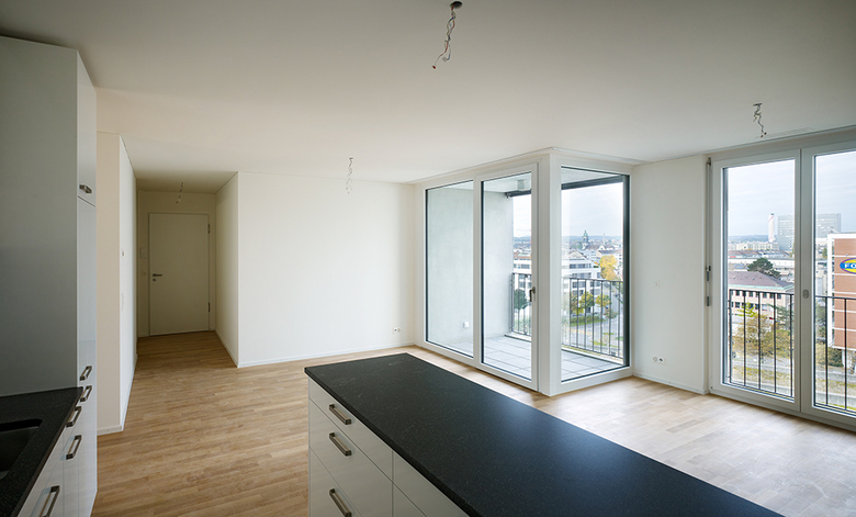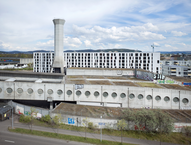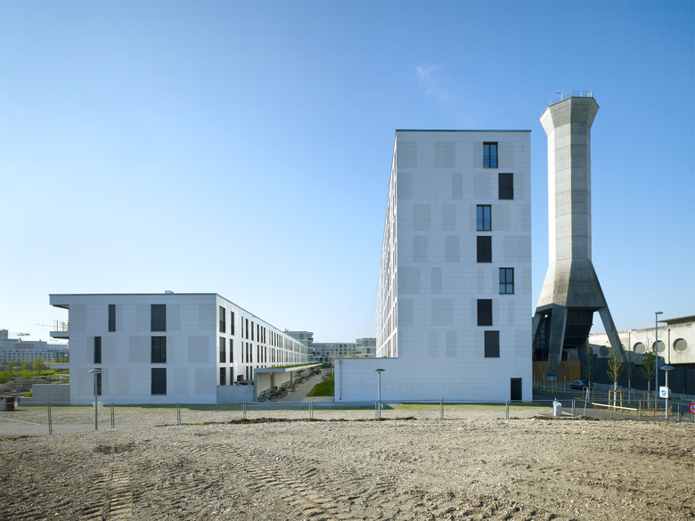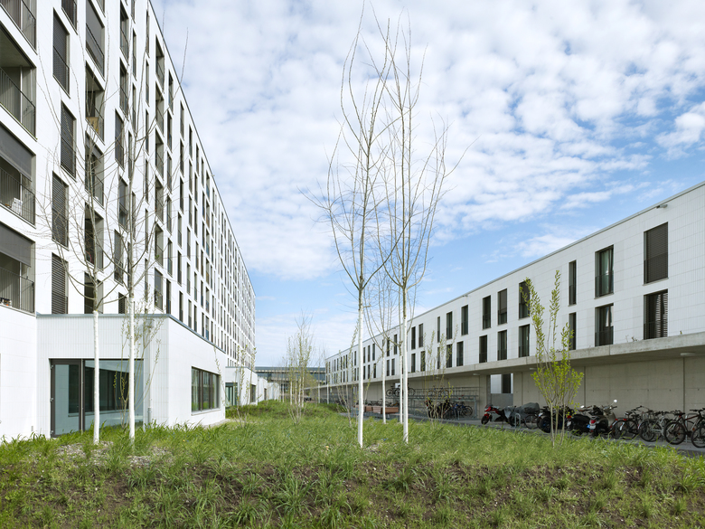 Die Bebauung ist als einheitliche Grossform mit unterschiedlichen Gebäudehöhen, Höfen und Einschnitten konzipiert. Dieses Konzept des differenzierten Volumens soll durch die Fassadentypologie verstärkt und präzisiert werden. Offene und unterschiedliche, geschlossene Elemente gliedern das lange Gebäude. Vier eingeschossige Höfe strukturieren das Erdgeschoss und bilden zusammenhängende Nutzflächen, die modular und frei unterteilbar sind. Die vorgeschlagene Erdgeschossform, die sowohl als Grossraum als auch als Kleinsteinheit genutzt werden kann, stellt ein neuartiges Konzept dar. Die grosse Flexibilität, die Vielfalt der Nutzungsmöglichkeiten sowie die Attraktivität der zu den Höfen hin orientierten Räume reduzieren das Risiko des Leerstands. Der achtgeschossige Hochbau auf der Westseite der Parzelle wird über vier Infrastrukturkerne effizient erschlossen. An diesen sind vier- bis sechsspännige Anlagen mit insgesamt 126 Geschosswohnungen unterschiedlicher Grösse angeordnet. Der östliche, dreigeschossige Gebäuderiegel nimmt 48 Geschosswohnungen auf, grösstenteils grosszügige Familienwohnungen. Die Erschliessung erfolgt über sechs Treppenhäuser.