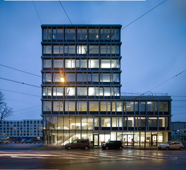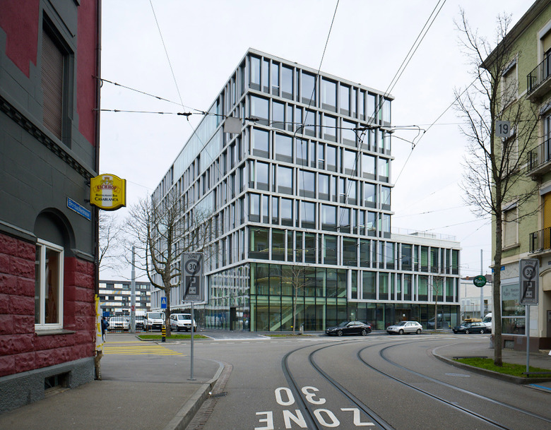 Die Fassade des Gebäudes ist mehrschichtig aufgebaut. Die innere Glasschicht mit undurchsichtigen Brüstungsfeldern bildet einen homogenen Kubus. Dieser kommuniziert seine innere Funktion nach aussen und macht die mehrschichtige Architektur des Gebäudes transparent. Die äussere Gebäudeschicht aus vertikalen und horizontalen Faserbetonelementen strukturiert das Volumen in einer aufgelösten Ordnung. Dies verstärkt die Präsenz und Kraft des Neubaus im städtischen Kontext.