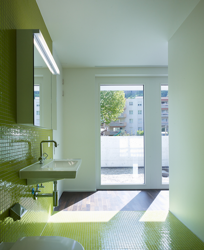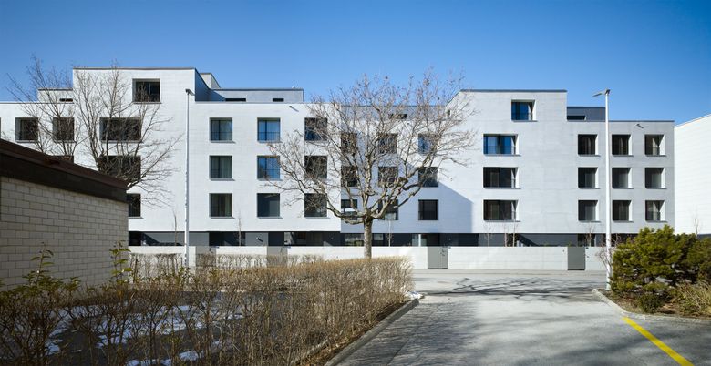 Die Obergeschosse werden konventionell über Treppenhäuser erschlossen. In zwei dreispännigen Anlagen werden grosszügige, konsequent zum Park orientierte Stadtwohnungen angeordnet. Charakteristisch für die Wohnungen sind die offenen, lichtdurchfluteten Raumsequenzen sowie ihre konsequente Orientierung zum Aussenraum im Westen. Grosszügige und gedeckte Balkone werden in das Gebäudevolumen integriert und bilden eine räumliche Erweiterung der Wohn- und Essbereiche.