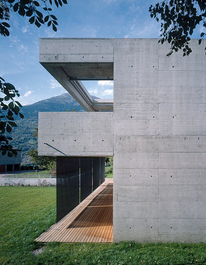Auf einem sanft ansteigenden Plateau über der Stadt Brig gelegen, orientiert sich das Haus nach Südwesten längs ins offene Tal hinaus. Die durchgehende Balkonschicht im Obergeschoss betont zusätzlich die Hinwendung zur Sonne. Ein Betonrahmen über dem Balkon spendet Schatten und fasst den Kubus zusammen. Im Inneren folgt der Grundriss der strengen und doch offenen Ordnung des Baukörpers. Das Erdgeschoss ist ein einziger grosser Raum, der mit Schiebetüren unterteilt werden kann. Im Obergeschoss reihen sich die Zimmer entlang des fassadenseitigen Korridors auf.