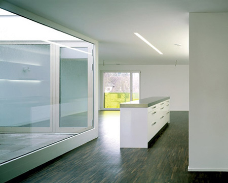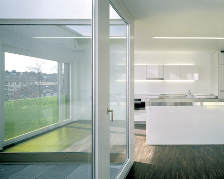Das Projekt ist das Ergebnis eines Studienauftrags und setzt mit dem reduzierten, kubischen Bauvolumen in der heterogenen Agglomerationsumgebung einen deutlichen städtischen Akzent. Sandquarz-Anteile in der glatten Aussenputz-Fassade beginnen je nach Tageslichtintensität zu schimmern und verleihen dem Monolithen hinter der markanten Pappelreihe einen edlen Glanz, der an ein festliches Glitzerkleid erinnert. Dass es jedoch kein auftrumpfendes, sondern ein dezentes Kleid ist, zeigt die radikale Beschränkung der Öffnungen auf ein einziges Fensterformat im zwar strengen, aber nicht sklavisch befolgten Raster. Im Gegensatz dazu stehen die weitläufigen, offenen Wohnungen, die dem Prinzip des Mäanders folgend, eine reichhaltige Abfolge von Raumeindrücken offerieren.