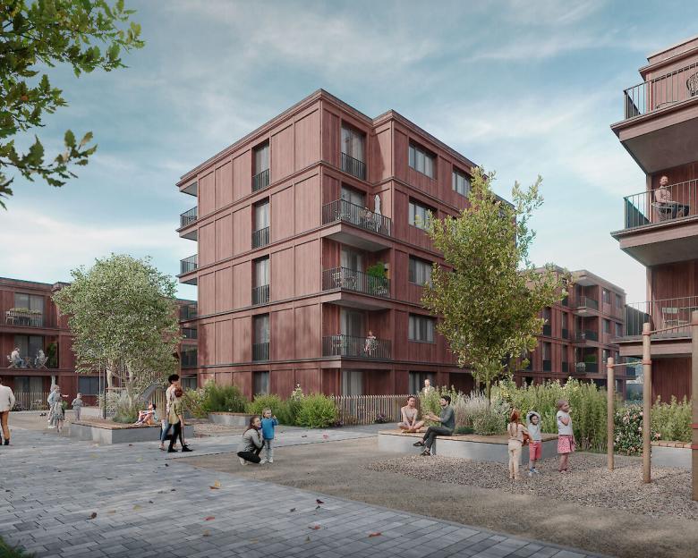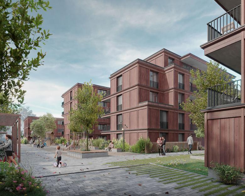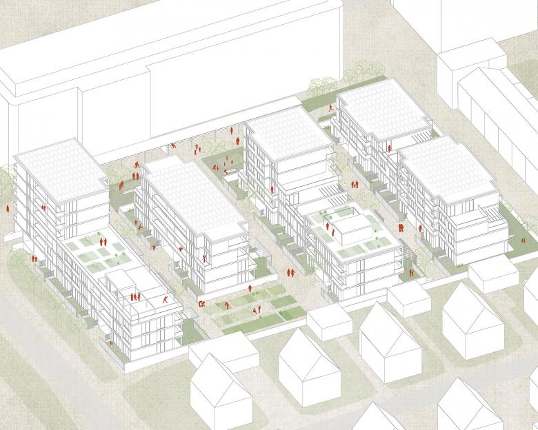 Das Konzept basiert auf dem städtebaulichen Grundgedanken, die vorhandene Zeilenstruktur durch die Setzung von vier riegelförmigen Volumen weiterzuführen. Diese ergänzen die Quartierstruktur im vorhandenen Kontext und gewährleisten eine strukturelle Differenzierung zwischen gefördertem Wohnraum und Eigentum.