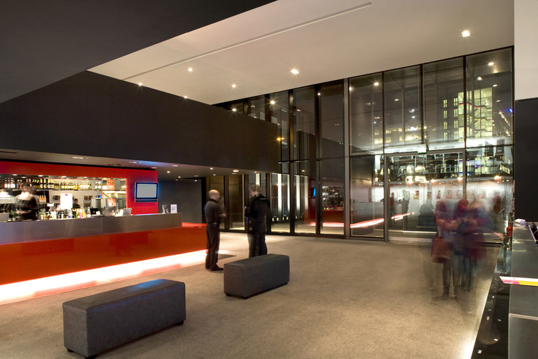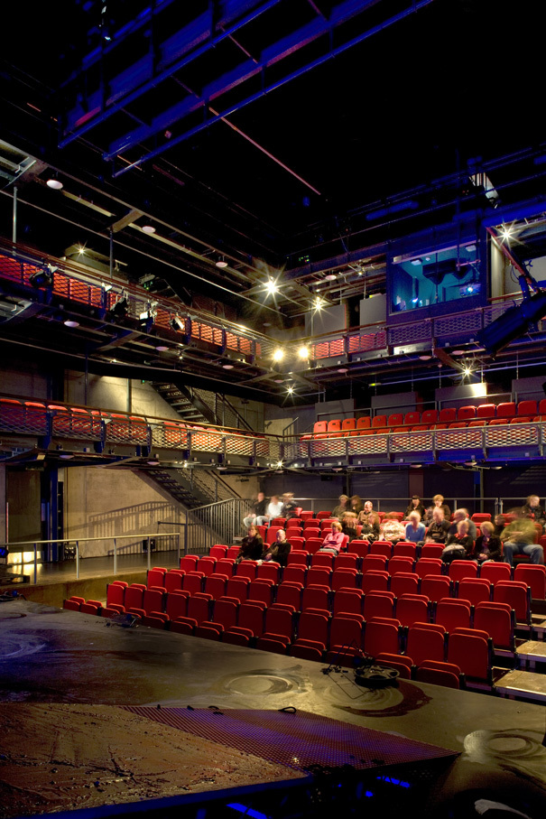 Our extension is strongly vertical, contrasting with the lower-slung horizontals of the original theatre. Through the combination of differently-sized volumes plus the contrasting use of coloured renders and translucent panels, it functions as a beacon that signals the theatre’s presence within an evolving cityscape and which responds to the scale of an adjacent new mixed-use development. Inside, the new foyers connect with the 1958 public spaces, which have been stripped back to their original appearance. The second auditorium is a flexible space which can be used in various configurations. Wrapped around it are new dressing rooms and technical spaces, whilst above is the theatre’s first purpose-built rehearsal room.