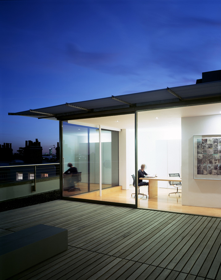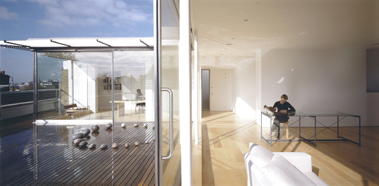 A new steel-framed structure was placed on the top floor of a warehouse to create an L-shaped apartment, open along its entire length onto a terrace with a full-height glazed wall. This extends the inside out and outside in, and allows for 360º degree city views. We tracked the path of the sun from morning to night and from season to season to select the optimum position for the apartment and harness the flow of light, giving a living space constantly changed and coloured by nature.The inside and outside were viewed as one space, by carefully using glass, stainless steel, overlapping levels, screens, sliding panels and timber flooring. A simple open-plan living and dining area was created that doubles as a flexible living space and stimulating backdrop for client meetings and creative work. Bespoke furniture was designed as sculptural elements within the space – with sliding doors and a folding floor concealing the kitchen. To manage the environment effectively, flat radiators were carved into the walls, underfloor heating was installed and concealed sun shading blinds were used. A limited palette of materials and plaster walls reflect light around the space.