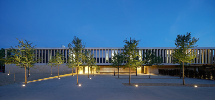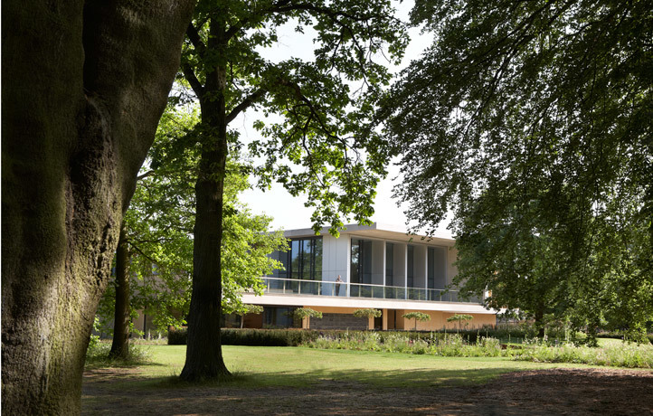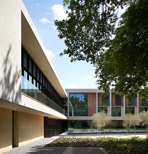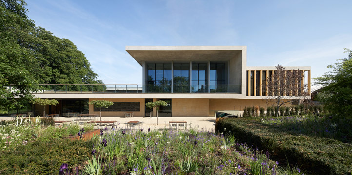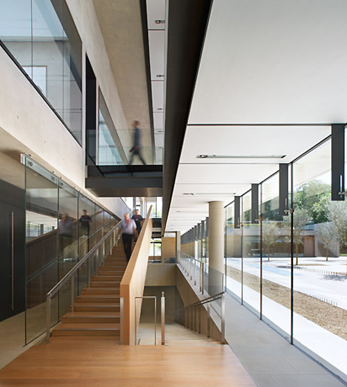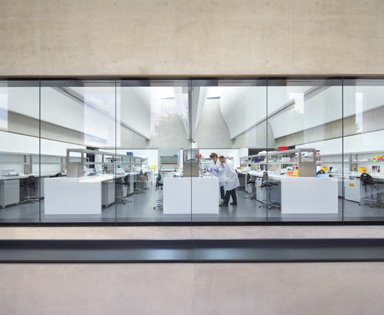 Here the ‘thinking path’ is reinterpreted in the tradition of the monastic cloister or collegiate court as a space for reflection, debate and interaction that also enjoys good views of the Garden itself. In this respect, the solidity implied by the strata-like conception of the building (with alternate layers of stone and concrete) is balanced by a concern with permeability that is manifested in the expansive glazing to the ground and first floors and which reinforces the close relationship between the new Laboratory and the Garden which provides the fundamental raison d’etre for the research it will house.