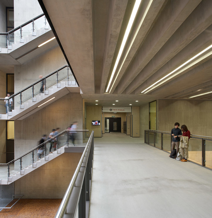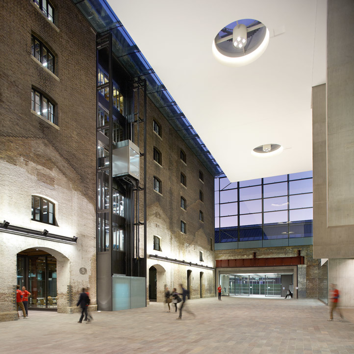 The design combines the 19th century Grade II listed Granary building and transit sheds – with a 200 metre long new building that uses industrial materials and creates robust spaces for the students, full of natural light. An internal street draws daylight in and acts as a central circulation spine with suspended walkways, cafes, film, graphic and light projections. The spaces are designed to be flexible and ‘raw’, to allow the different departments within the college to develop their own identities, whilst maintaining the integrity of the buildings as a whole.Performance spaces including two theatres and dance studios are designed alongside exhibition areas, a roof garden, bar and ticketing area. A sustainable energy strategy, including photovoltaic cells, allows us to work towards a BREEAM rating of ‘excellent’.The new campus will provide an unparalleled inspirational and creative space for the university and its students.