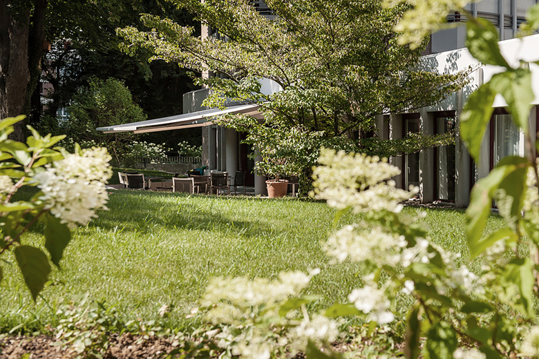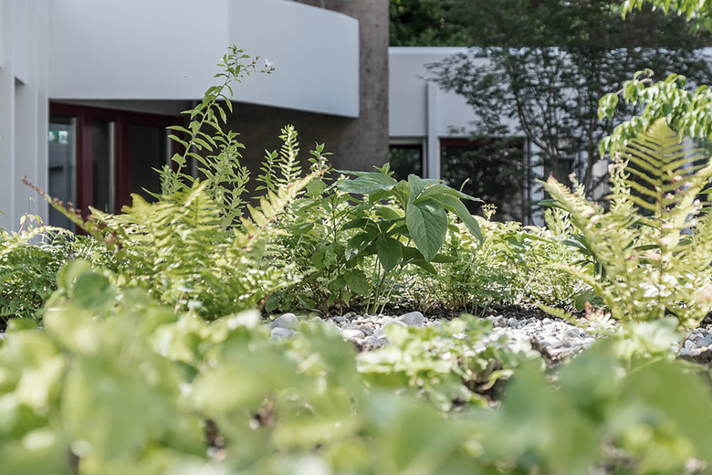 Das Freiraumkonzept sieht eine primäre Klärung des Bestands vor. Der umlaufende, quartierstypische Heckensaum wird gestärkt, geklärt und punktuell ergänzt. Die Formensprache der Wege wird vereinheitlicht und der Erlebnisfaktor für die Bewohner erhöht. Während der westliche Gartenteil durch seine mächtigen Bestandsbäume geschützt im lichten Schatten liegt, finden sich die Bewohner im Ostgarten in einem wunderbar sonnigen Obst- und Küchengarten mit Pergola und Brunnen wieder. Begleitet werden die Wege von blumenreichen Stauden-, sowie kurz gehaltenen Rasen- und Wiesenflächen. Der Eingangsbereich wird in einen räumlich wirksamen, gut organisierten Vorplatz für den neuen attraktiven Eingangsbau umgewandelt. Ein mäandrierendes System aus Kies- und Staudenflächen generiert den abwechslungsreichen Raum zwischen umlaufenden Gebäudegang und den Büroräumen.